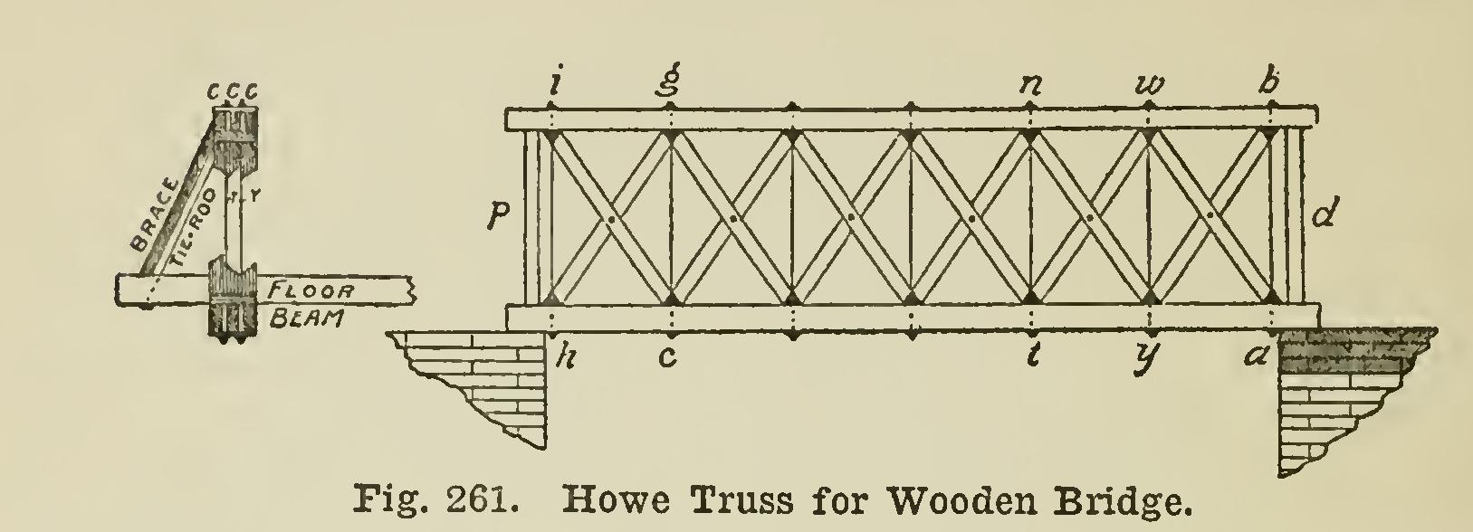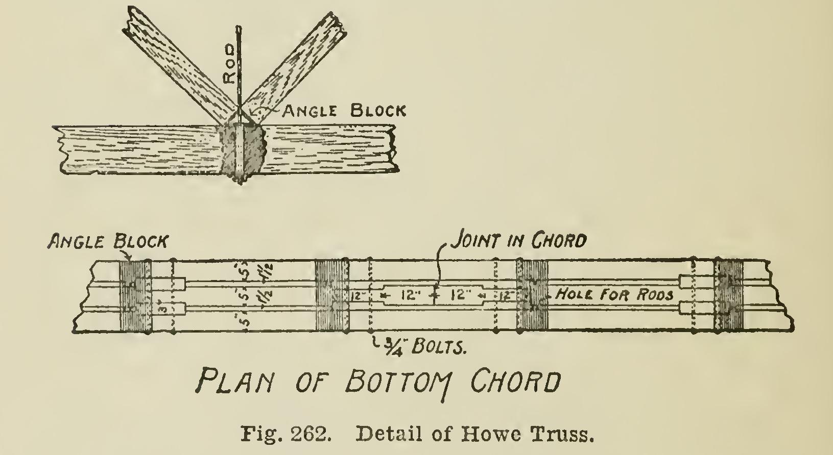 Road Bridge. Fig. 261 illustrates a small wooden Howe truss bridge. The top and bottom chords are made up of three or more parallel timbers c c c, placed a small distance apart so as to let the tubes on the angle blocks which receive the tie-rods r r pass between them. The main braces are in pairs or in threes; the pieces composing them abut at top and at bottom against triangular angle blocks (see Fig. 262), which are usually made of cast iron, being hollow and about one-half inch thick and strengthened by inner ribs.