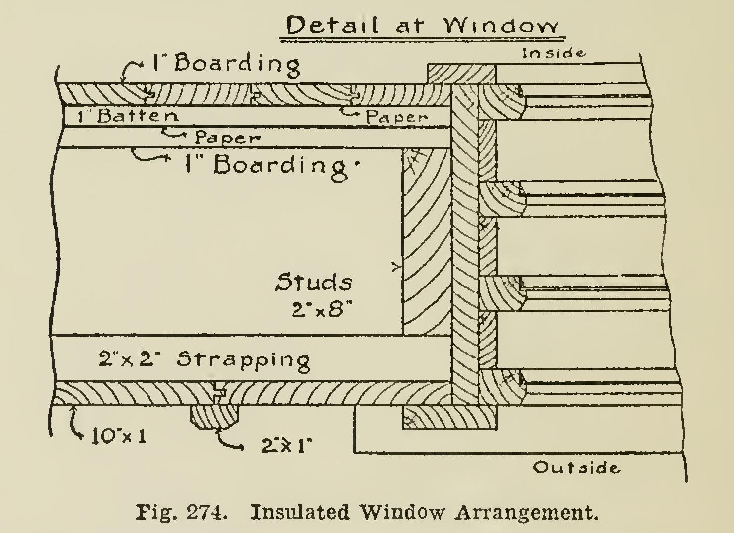 The windows in the refrigerator chamber are quadruple (see Fig. 274). Each of the four sashes is fitted closely into the frame, and held in place with stops, as shown in detail. The window frame is of stout 1-inch stuff, and the sill is 2-inch. Great care must be taken in making the window-frame, so that no leaks can occur. This is important, for the efficiency of the whole plant depends upon every part being as far as possible air-tight, so that the condition of the atmosphere outside shall not interfere with the circulation in the interior.