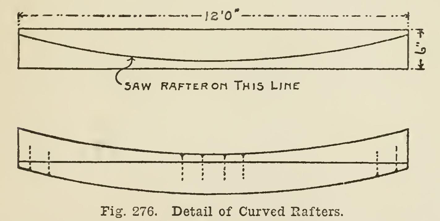 First make the pattern the curve and length needed, by describing a section of a circle having the proper radius to cut within an inch or half inch of the top and bottom edges of the rafter as shown in the detail drawing, Fig. 276. To make the radius, use tram points, if you can get a bar long enough; but a light wire will probably be better, because the length in some cases will be twenty or thirty feet. There is too much stretch to a chalk line.