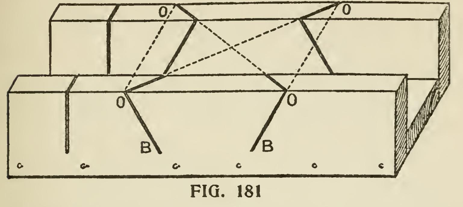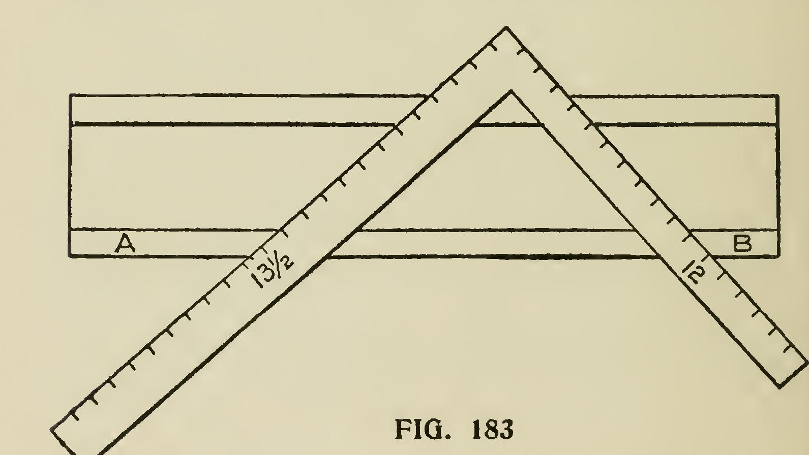 The lines A and B show the top of the mitre box with the lines marked on. The side marked 13/ inches is the side to mark from; this must be borne in mind, and it must be remembered that this bevel must be used for both cuts, the 12-inch side not being used at all.