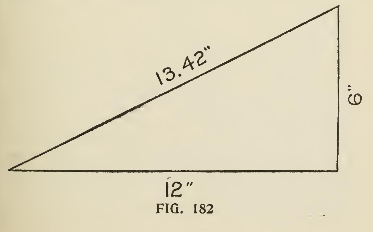 One of the most troublesome things the car penter meets with is the cutting of a spring mould ing when the horizontal portion has to mitre with a gable or raking moulding. Undoubtedly the best way to make good work of these mouldings is to use a mitre box. To do this make the down cuts, B,B (Fig. 181), the same pitch as the plumb cut on the rake. The over cuts 0,0,0,0 should be obtained as follows : Suppose the roof to be a quarter pitch—though the rule works for any pitch when followed as here laid down—we set up one foot of the rafter, as at Fig. 182, raising it up 6 inches, which gives it an inclination of quarter pitch; then the diagonal will be nearly 13/ inches. Now draw a right-angled triangle whose two sides forming the right angle, measure respectively 12 and 13/ inches, as shown in Fig. 183.