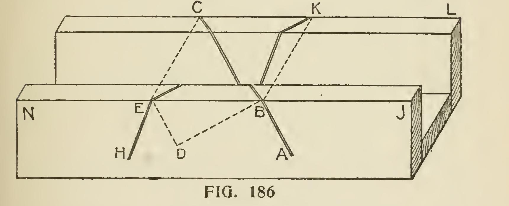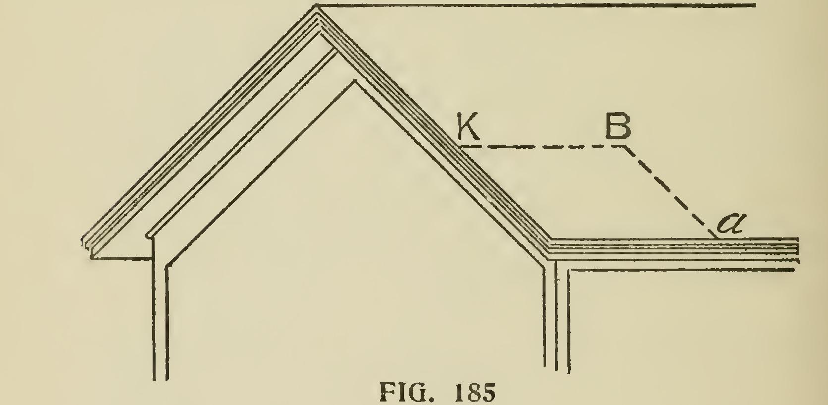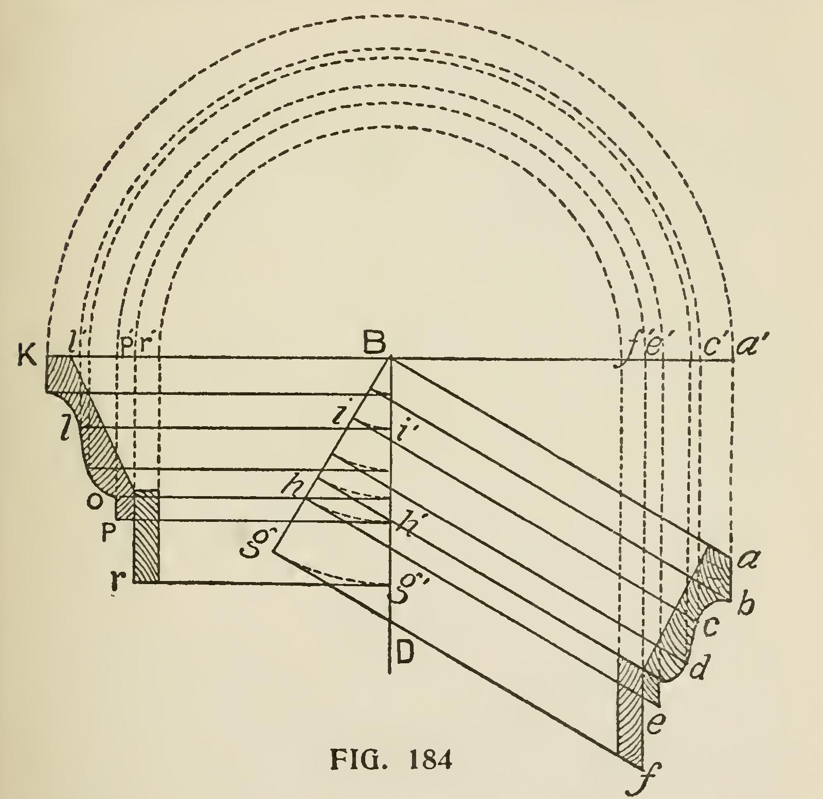The principles on which the method is based being, first, that similar points on the rake and horizontal parts of a cornice are equally distant from vertical planes represented by the walls of a building ; and, second, that such similar points are equally distant from the plane of the roof. Representing the wall faces of a building by the line DB (Fig 184), and a section of the horizontal cornice by DBabcdef Bab being the angle of the roof pitch, draw line aa', cc', ff', parallel to DB and intersecting the line ka', which is drawn at right angles to DB through the point B ; then, with B as a center, describe the arcs a'k, c'1', etc., intersecting the same line ka' on the opposite side of DB. This gives the point k at the same distance from DB as the points a and a', and the line 11' at the same distance as cc'. The rest of the same group of parallel lines are found to be similarly situated with respect to DB.