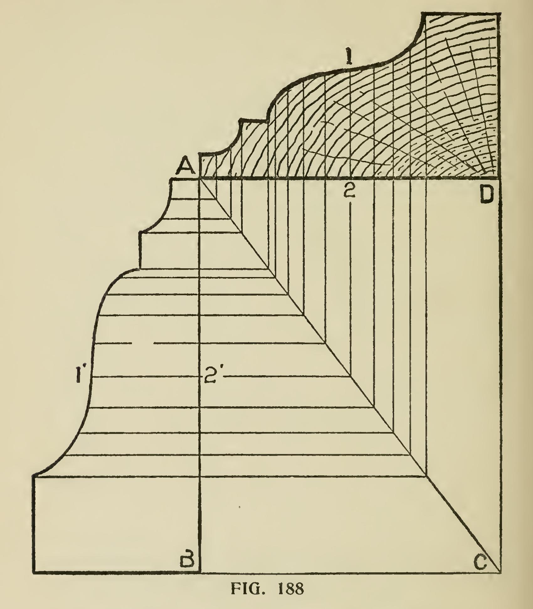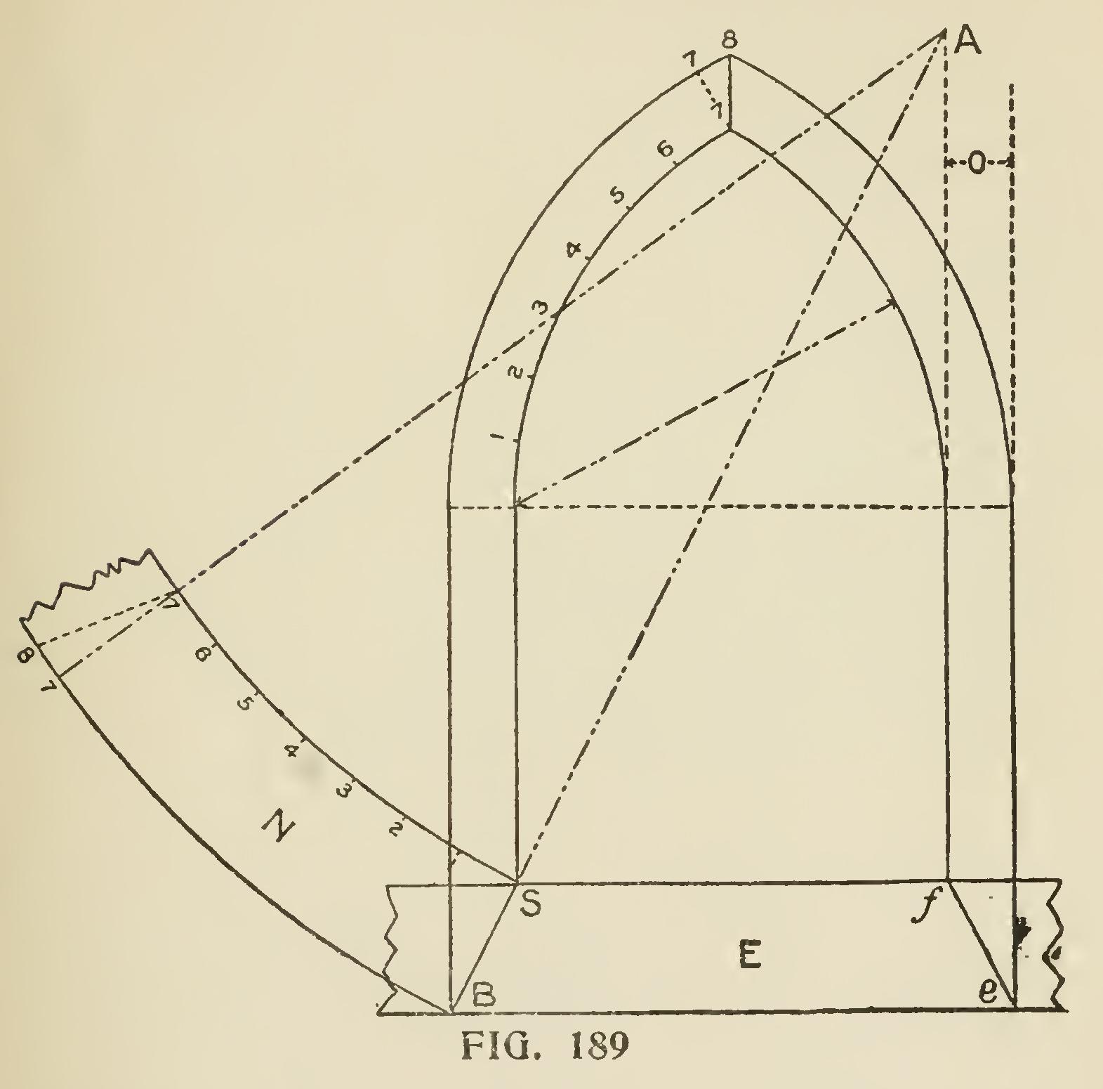 Fig. 188 shows the manner of finding propor tons of a small moulding which is required to miter with a larger one, or vice versa. Let AB be the width of the larger moulding, and AD the width of the smaller one; construct with these dimensions the parallelogram ABCD, and draw its diagonal AC. Let AB be the section of the moulding which we wish to reduce to member with a moulding the width of AD. Draw any number of parallel lines to BC cutting the line AC, from which points draw lines parallel to DC and beyond the line AD. From the latter set off the thickness of the mould ing on the corresponding lines as 1-2 will give the contour of the mould for the lesser width or vice To Obtain Correct Shape of a Veneer. Fig. 189 exhibits a method of obtaining the correct shape of a veneer for covering the splayed head of a gothic jamb. E shows the horizontal sill, of the splay, FA the line of the inside of jamb, o the difference between front and back edges of jamb, BA the line of splay. At the point of junction of the lines BA, FA, set one point of the compasses, and with the radius AB draw the outside curve of n; then with the radius AS draw the inside curve, and n will be the veneer required. This will give the required shape for either side of the head.