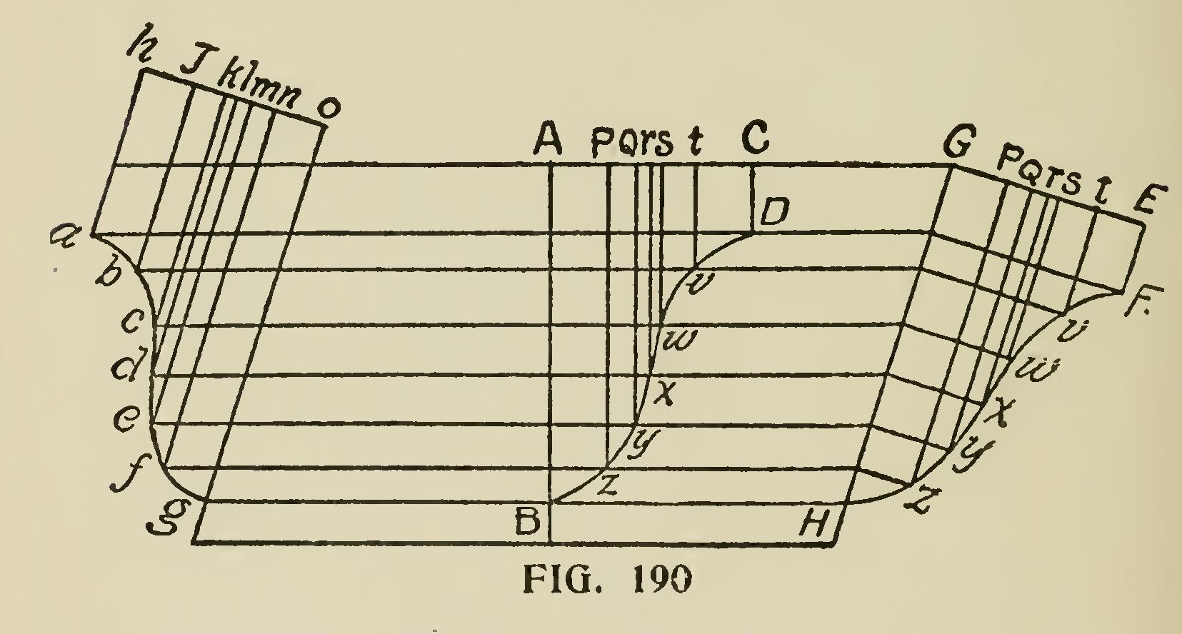 To get the contour or outline for a raking mould ing, proceed as shown in Fig. 190. The horizontal moulding is divided into any number of parts, equal or unequal, as shown at abcdefg. The line AC shows the rake or inclination. Draw lines parallel with AC, from a to D, b to v, etc. Drop a line AB, perpendicular to AC, at any convenient point on the rake, make the distance AC equal to ho ; then drop the lines pgrst, and where these lines cut the lines abcdefg, these points of contact will be in the curve line of the rake moulding, as at Dvwxyz. From these points trace the curve, which will be the proper shape for the moulding.