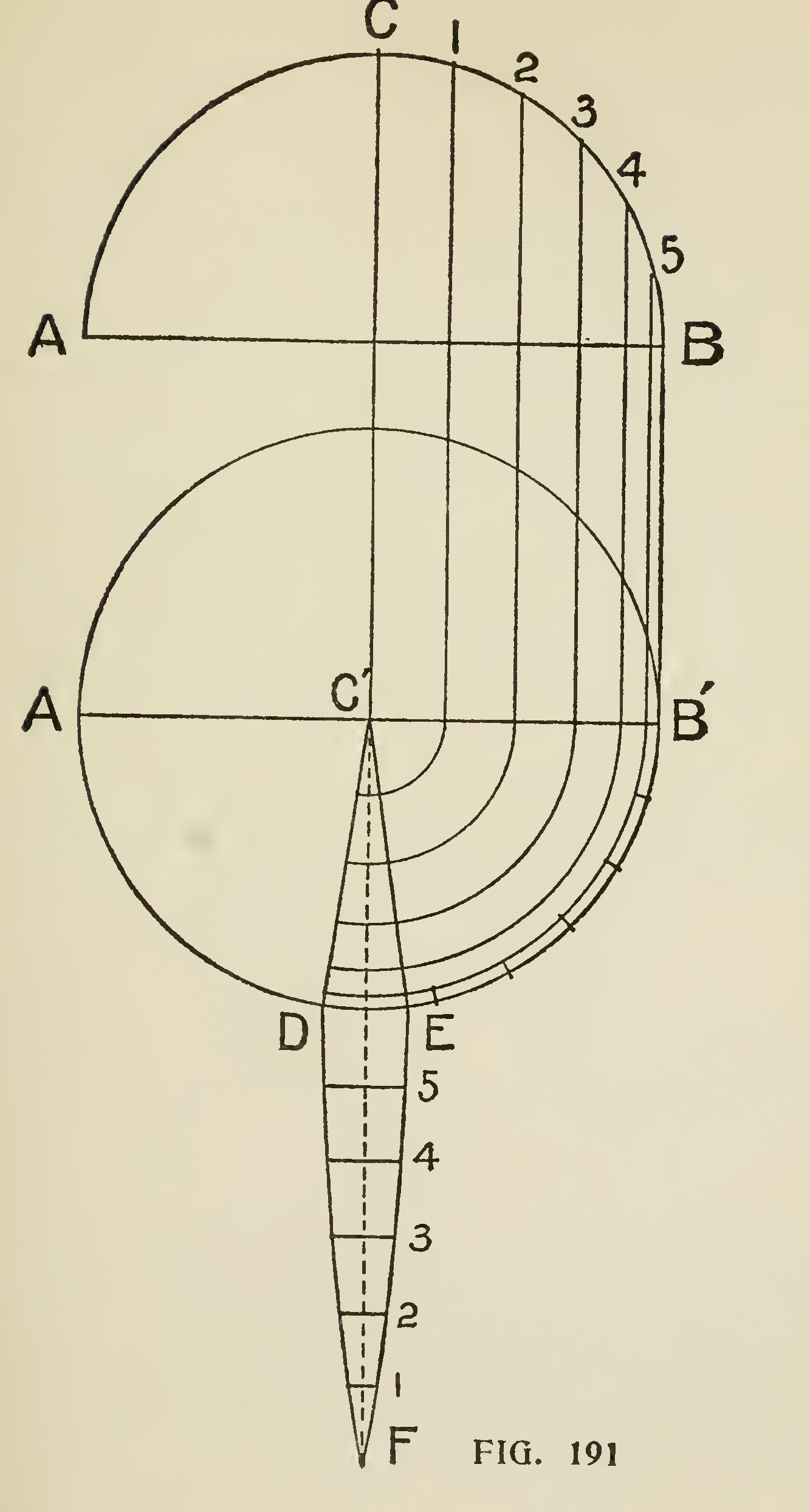 To Cover a Circular Dome with Vertical Board= ing. The upper part of Fig. 191 represents the elevation of the dome, and the lower part repre sents the plan and the shape of the board in the stretch-out. Divide the diameter of the dome into spaces equal the width of the boards to be used. Divide one side of the elevation into any number of equal parts, as 1, 2, 3, etc., and from these points draw parallel lines down to the diameter of the plan as at C"B". From C" as a center draw lines C"D" and C"E which represents the board in its respective place on the dome. From C" as center and with the points 1, 2, 3, etc., on the diameter swing around to C"D and C"E as shown; and on the line C"F lay off the distance 5, 4, 3, etc., which will be the correct length or stretch-put of the board. The length of the cross lines between C"D and C"E governs the length of the cross lines of the board. Care should be taken to not have the boards too wide, as the narrower the boards the better they will fit the dome.