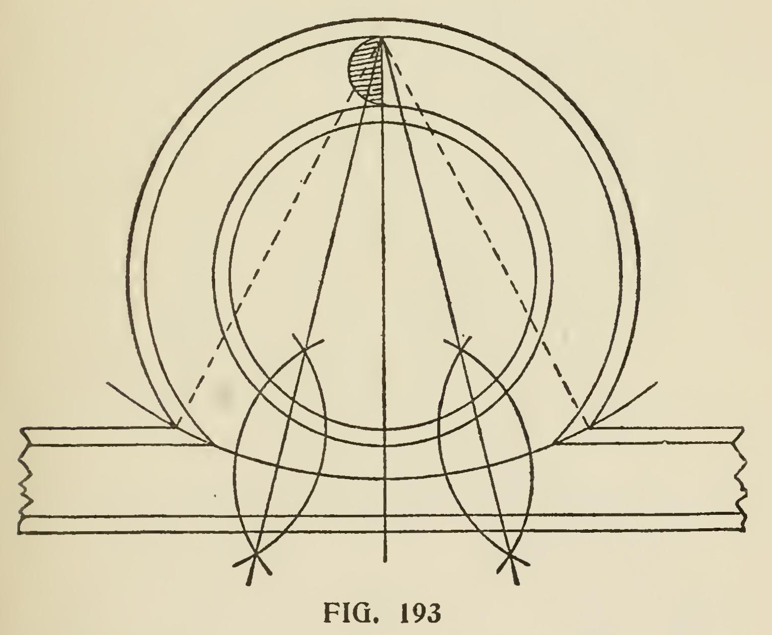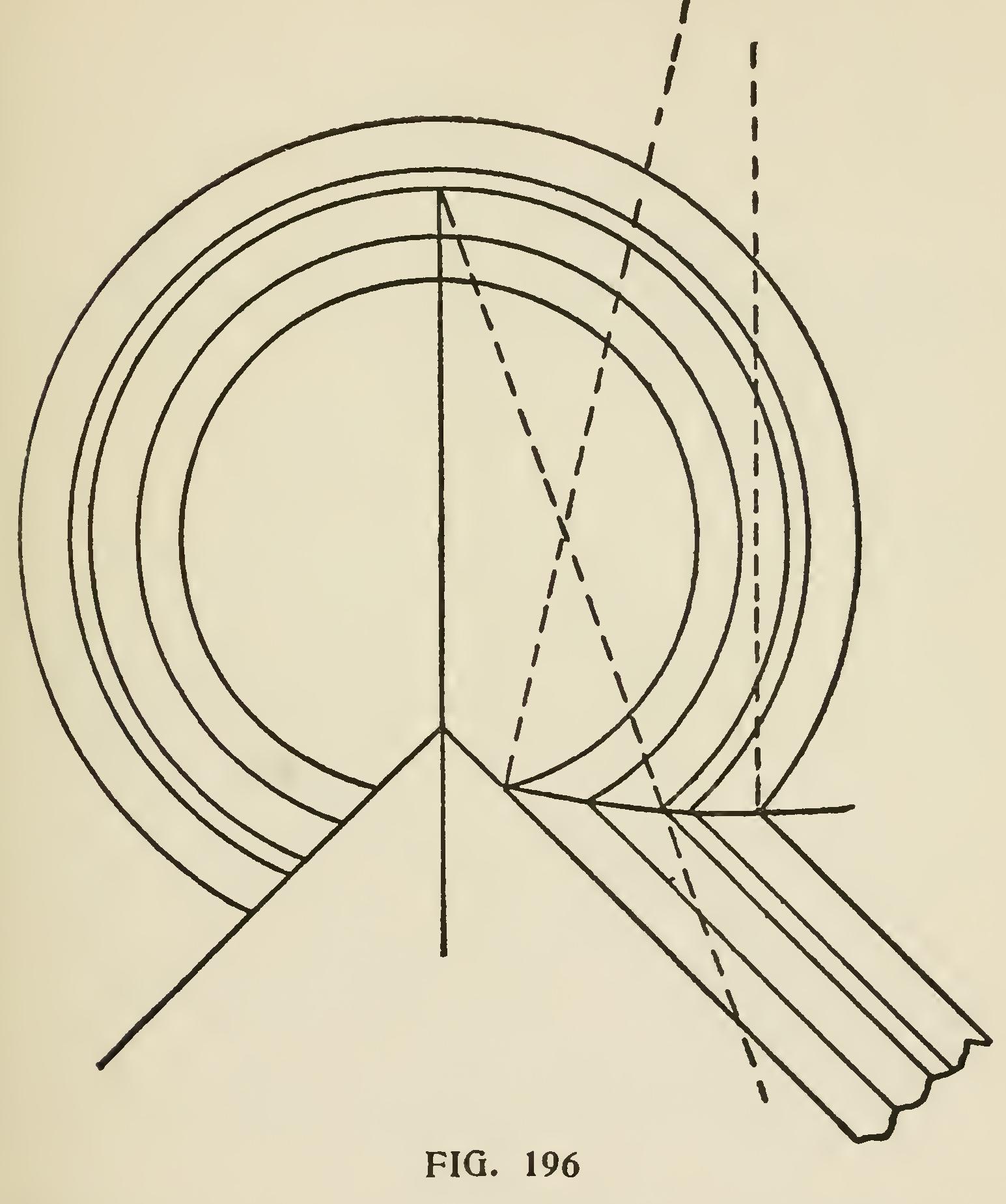 Sometimes the workman will find it necessary to miter in circles between two lines of mouldings, and to do so the circular moulding must be made with a diameter large enough to have the solid wood adjoin the solid wood of the running mould ings, as shown at Fig. 192. It will be seen that the points of juncture of the various members of the mouldings do not run in a straight line, thus making the miter-joint a little curved, which ad mits of the mouldings working together accurately without requiring to be pared.