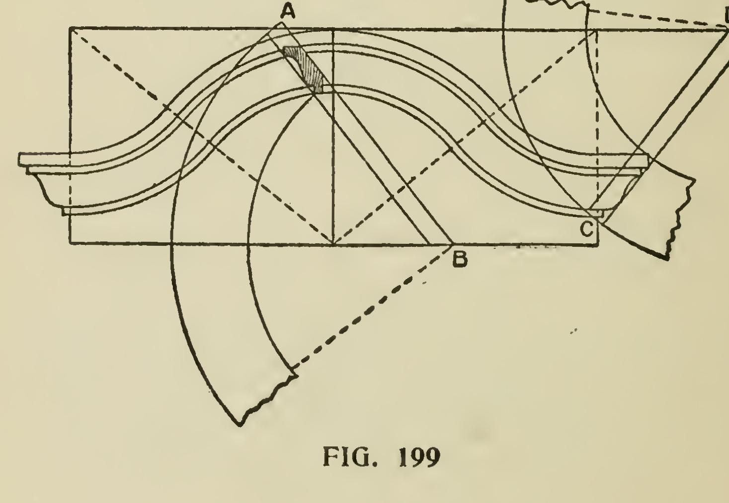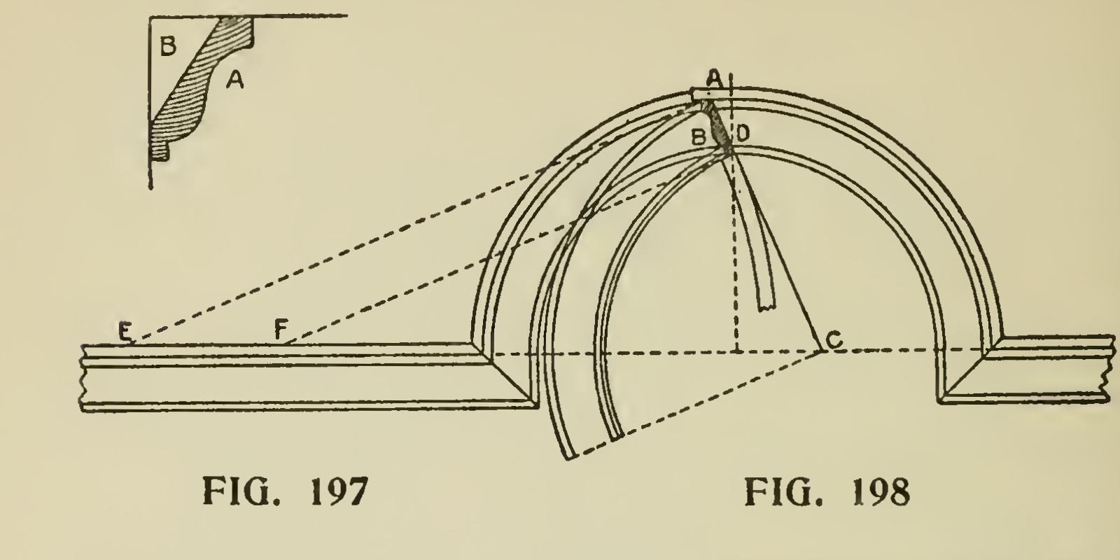 A spring moulding is one that is made of thin stuff, and is leaned over to make the proper pro jection, as shown at Fig. 197. A shows the spring moulding; B the space left vacant by the leaning of the moulding. These mouldings are difficult to miter, more particularly so when the joint is made with a raking moulding that springs also. Some of the methods given for obtaining the cuts for raking mouldings may be used for cutting these mouldings when the work is straight, but when circular the application of other methods is some times necessary. Many times the workman will come across very knotty operations of this kind to work out, and the following diagrams will then prove exceedingly useful: Fig. 198 exhibits an elevation of a circular moulding mitered into a horizontal moulding. The shape and plan of the moulding is shown at B. It is evident that by producing the line AD to intersect the center line of the arc at C, the central point will be obtained, from which the circular piece required for the moulding may be described. EA and FD give the radius for the curves of both edges when the stuff is in position, as shown in the elevation.