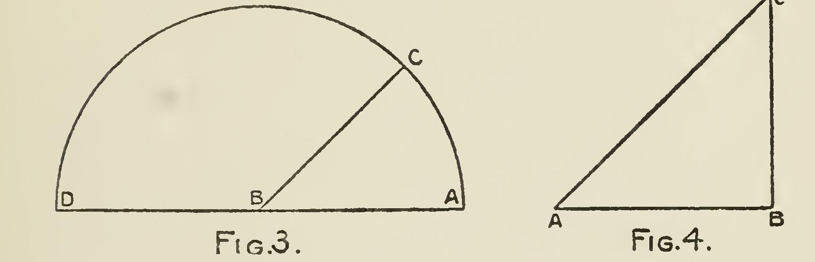 The difference between an obtuse angle and a semi=circle, or 180 degrees, is called the supple ment of that angle. For example, in Fig. 3, angle C D B is the supplement of the angle A D B because angle C D B, added to angle A C B, is equal to a semi-circle or an angle of 180 degrees.