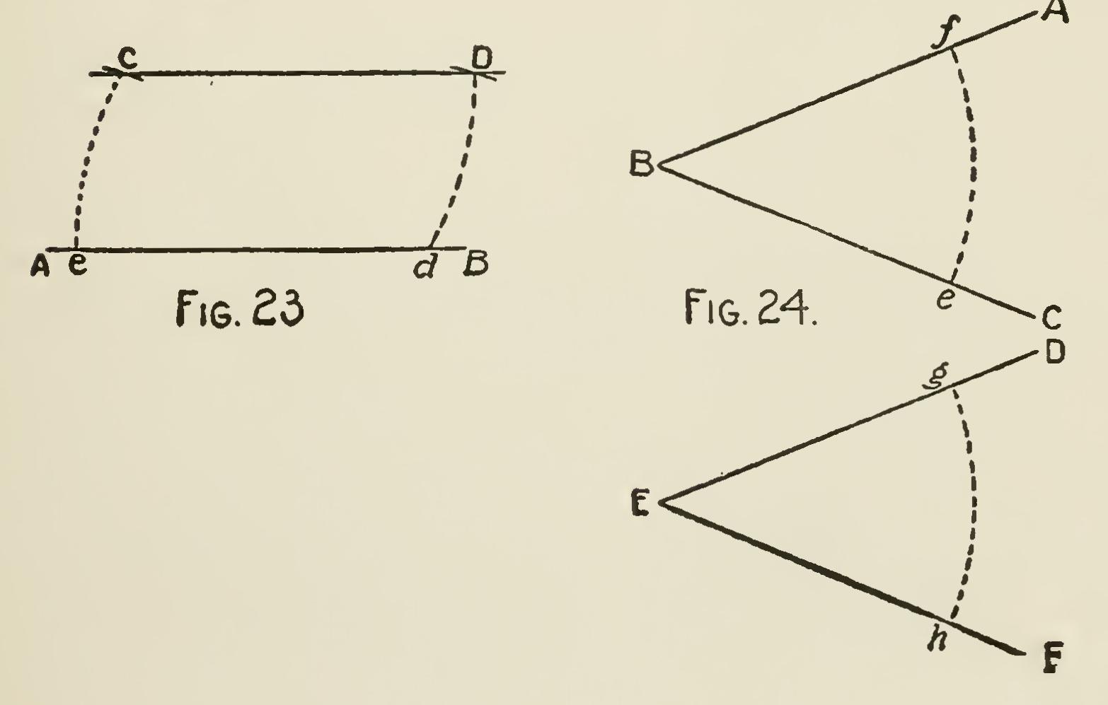 Problem 1.—Through a given point C (Fig. 23), to draw a straight line parallel to a given straight line A B: In A B (Fig. 23) take any point d, and from d as a center with the radius dC, describe an arc Ce, cutting AB in e, and from C as a center, with the same radius, describe the arc dD, make dD equal to Ce, join C D, and it will be parallel to A B.