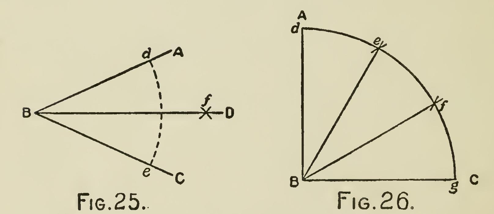 Probelm 3.—To bisect a given angle: Let A B C (Fig. 25) be the given angle. From the an gular point B, with any radius, describe an arc cutting B A and B C in the points d and e ; also, from the points d and e as centers, with any radius greater than half the distance between them, describe arcs cutting each other in f ; through the points of intersection f, draw B f D: the angle A B C is bisected by the straight line B D ; that is, it is divided into two equal angles, A B D and C B D.