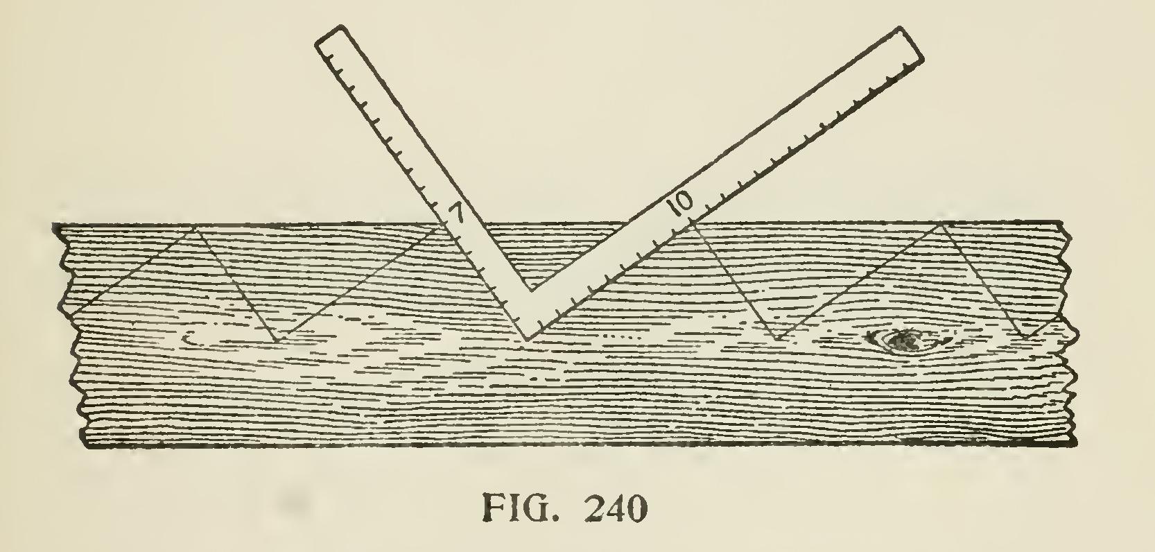 In laying out stairs, it is first necessary to determine the height from the top of the floor which the stairs start from, to the floor on which they are to land; also the run or distance of their horizontal stretch. This is found by dividing the height into the number of risers desired. This usually results in fractions of an inch to each rise. However, the fractions may be avoided by the use of the story pole, by spacing it off with compasses into the number of risers desired. This being done the rest is easy because the run is not usually limited as to exact space, and as there is always one less tread than there are risers, its length is deter mined by the width of the treads. Thus if there are 14 risers, there would be 13 treads. If the treads be 9 inches wide the run would be 9 times 13 or 117 inches, which is 9 feet and 9 inches as shown in Fig. 239. From this it will be seen that the run and rise of the individual step is taken on the steel square as shown in the illustration and determines the shape of the pitchboard. The way to make a pitch-board is by the use of the steel square, which, of course, every carpenter in this country is supposed to possess. Fig. 240 shows a part of the stair string with the square laid on, showing its application in cutting out a pitch-board. As the square is placed it shows 10 inches for the tread and seven inches for the rise.