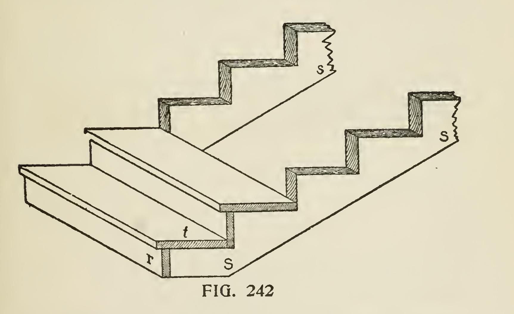 Fig. 242 shows a portion of the stairs in position. S, S shows the strings, which in this case are cut square; that is, the part of the string to which the riser is joined is cut square across, and the "butt" or end wood of the riser is seen. In this case, also, the end of the tread is cut square off and flush with the string and riser. Usually in a stair of this kind the ends of the treads are rounded off similar to the front of the tread, and the ends project over the strings the same distance that the front edge projects over the riser. If a moulding or cove is used under the nosing in front, it should be carried round on the string to the back edge of the tread, and cut off square. The riser is shown at r, and it will be noticed that it runs down behind the tread on the back edge, and is either nailed or screwed to the tread.