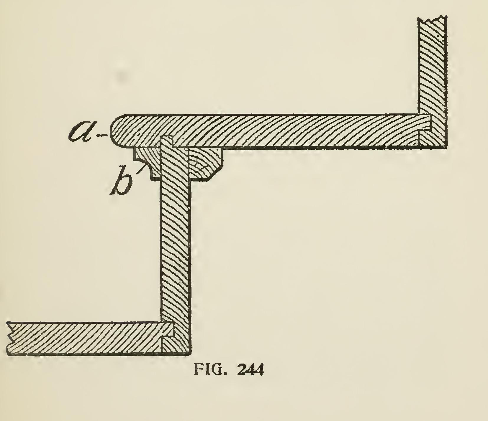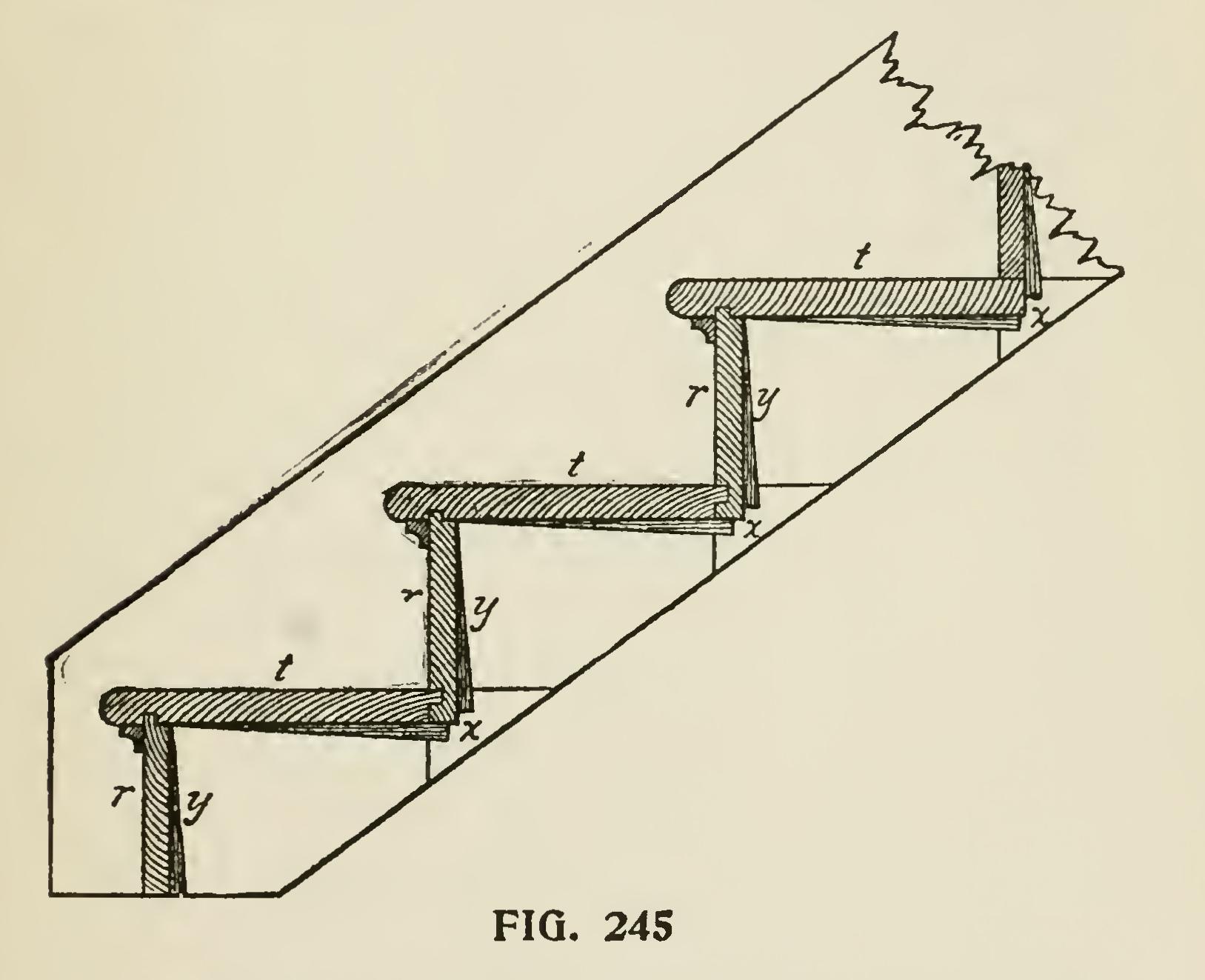 In Fig. 245 we show a sectional elevation through the steps. The treads, t,t, and the risers, r,r, are shown in position. These are secured as will be seen by means of the wedges, x,x, and y,y, which are well covered with glue before they are inserted and driven home. Stairs made after this manner are strong and perfectly solid under foot.