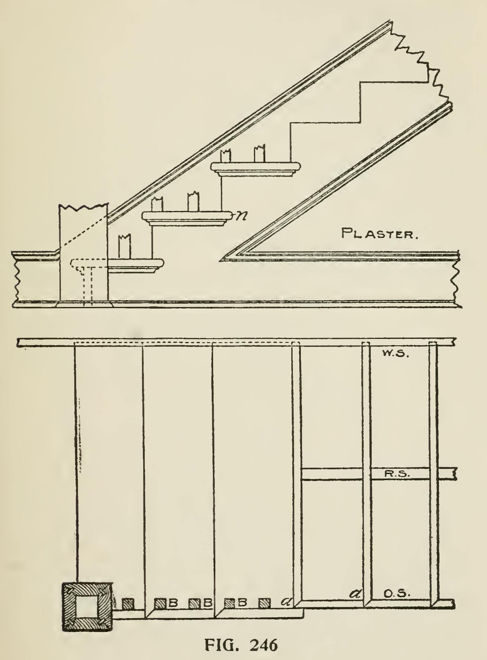 Fig. 246 gives two views of a portion of a better class stair, a stair with cut and mitered string, or open string stair. In referring to the plan, WS shows the wall string; RS the rough string placed there to give the structure strength; and OS the outer or cut string. At a,a, the ends of the risers are shown, and it will be noticed that they are mitered against the vertical or riser line of the string, thus preventing the end wood of the riser from being seen. The other end of the riser is in the housing in the wall string. The outer end of the tread is also mitered at the nosing and a piece of stuff made or worked like the nosing is mitered against, or returned at the end of the tread. The end of this returned piece is again returned on itself back to the string, as shown in the upper portion of the cut, at n. The moulding, which is a five-eighths cove in this case, is also returned round the string and into itself.