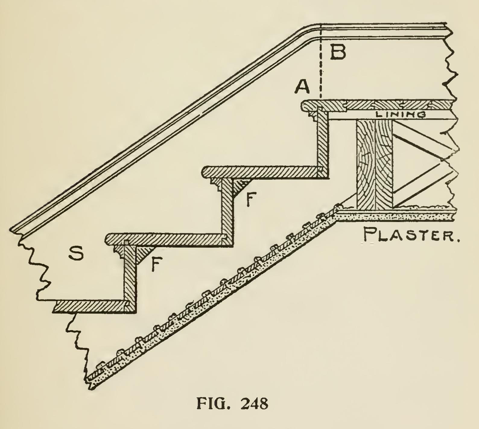 Fig. 248 shows the manner in which the wall string S is finished at the top of the stairs. It will be noticed that the moulding is worked round the ease-off at A to suit the width of the base at B. The string is cut over the floor horizontally and vertically or plumb against the joists. The plaster line under the stairs and on the ceiling is also shown.