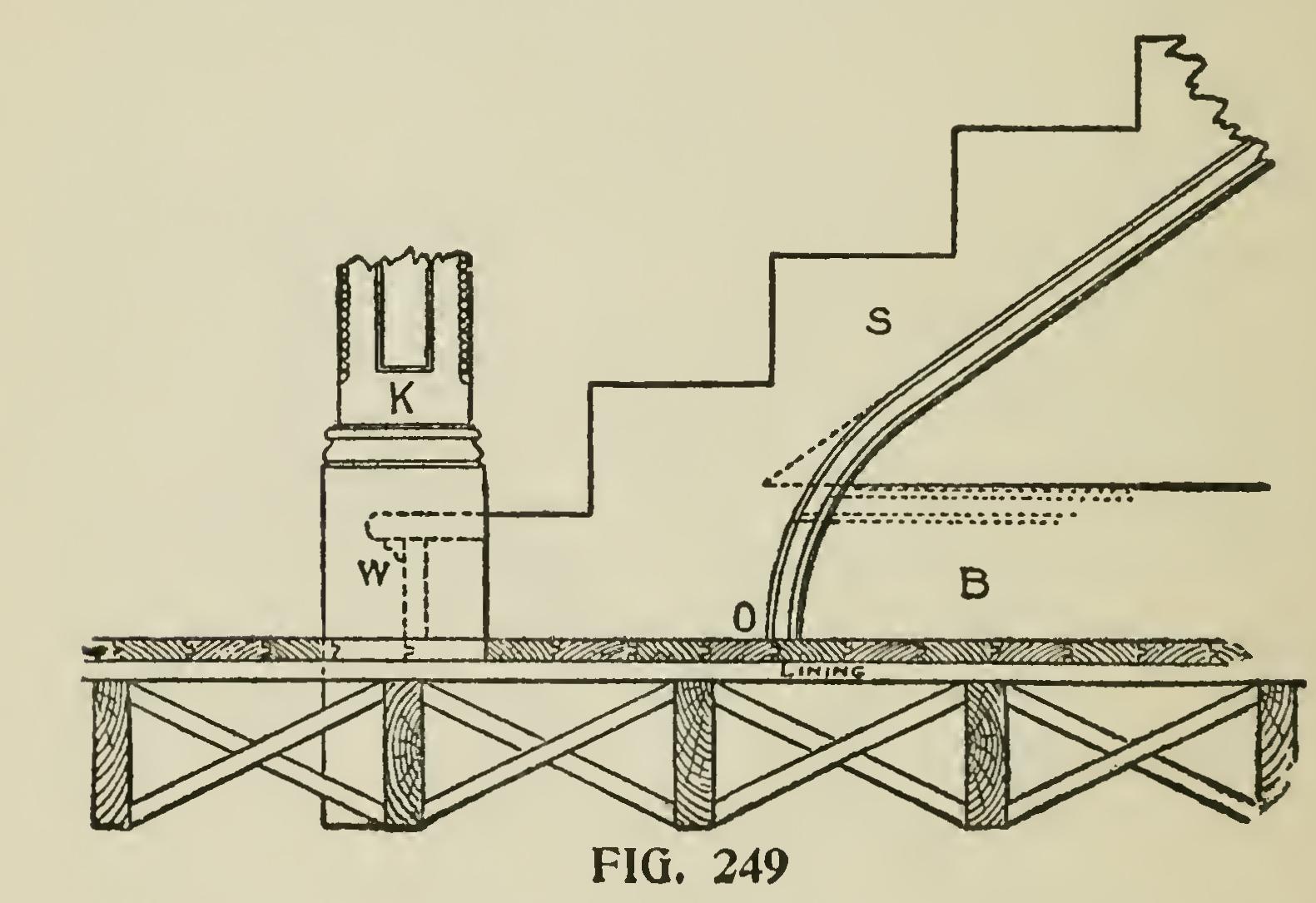 Fig. 247 shows the manner in which the wall string is finished at the foot of the stairs. S shows the string with a moulding wrought on the upper edge. This moulding may be simple ogee, or may consist of a number of members, or may be only a bead, or the edge of the string may be left quite plain ; this will be regulated in a great measure by the style of finish in the hall, or wherever the stairs are placed. B shows a portion of the baseboard, the top edge of which has the same finish as the top edge of the string. B and A together show the junction of the string and the base. The dotted line shows when a piece of stuff has been glued on to the string to make it wide enough at the junction to get the ease-off or curve. F,F show the blocks glued in the angle of the steps to make them firm and solid.