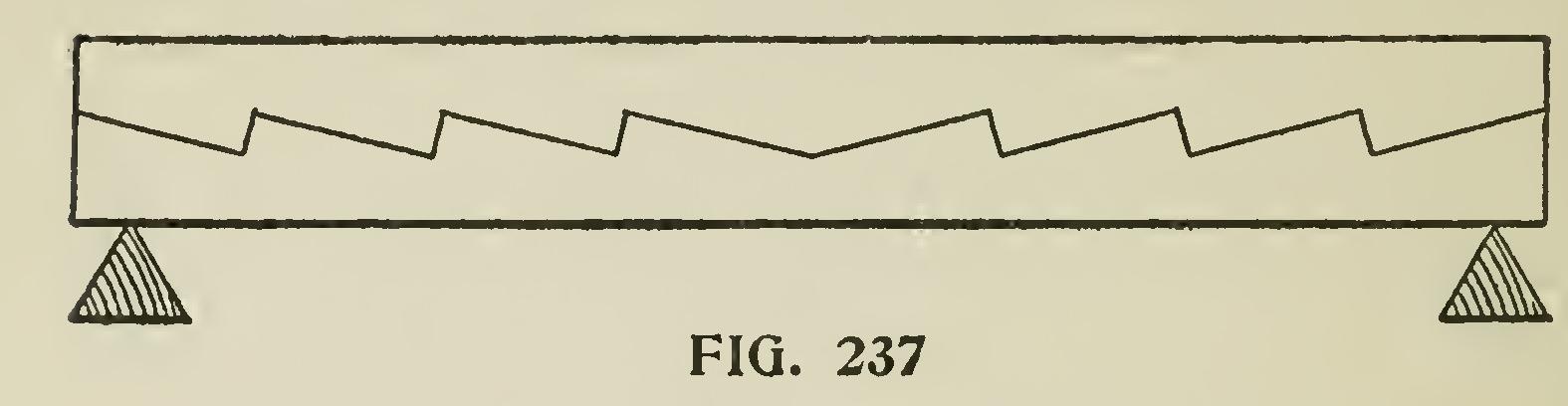 Wherever the principal strain on the beam may happen to be, to that point, as at C, Fig. 236, the indents should direct their square abutments ; that is, toward the straining force. When the beam is uniformly loaded, the greatest strain is at the middle.