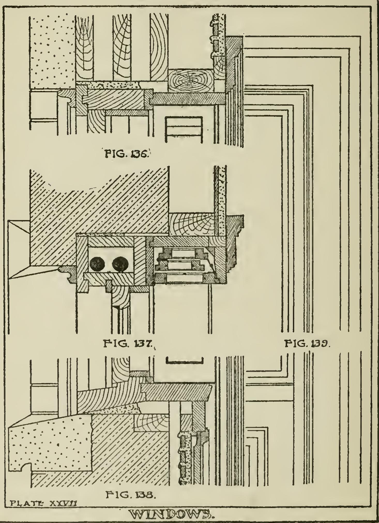 Fig. 131 is a section through the jamb of win dow. Stone quoins of various widths and heights are provided for masonry jambs.