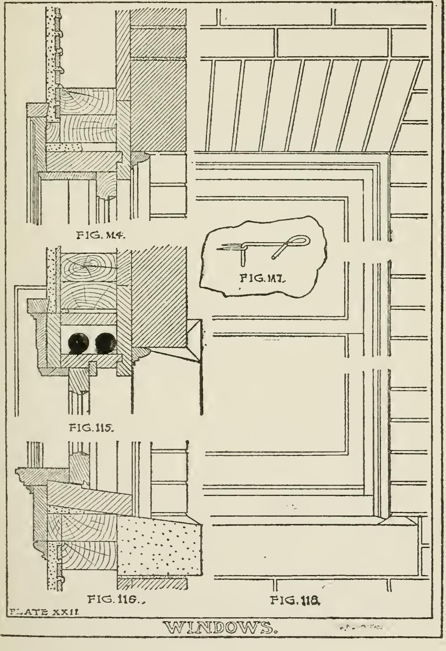 Fig. 114 is a section through the window head. Fig. 115 is a section through the jamb. Fig. 116 is a section through the still, and shows the wood sill lapping over the stone sill. The stone sill is made the thickness of two courses of brick, four inches longer than the width of brick opening, and six inches deep. It is made with a wash and with lugs at each end, projects one inch beyond the face of the wall, and extends back to the studding, over the sheathing. Fig. 118 is an exterior eleva tion of the window.