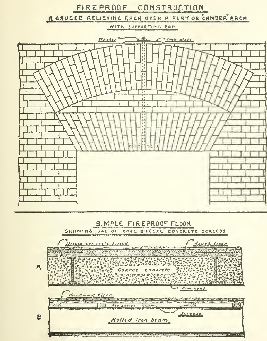 Fireproof Floors. The question of fireproof construction is by no means a new one, although the builders of the present generation have probably seen more attention devoted to it than did their predecessors. As showing an inter esting method of dealing with the lintel prob lem, the upper portion of Fig. 115 is worthy of attention. A flat or camber arch takes the place of the wooden lintel, and is supported by means of an iron rod from the crown of the relieving arch above. For first-class work it would be hard to surpass this scheme, but its cost would prevent its adoption in anything but the very best practice.