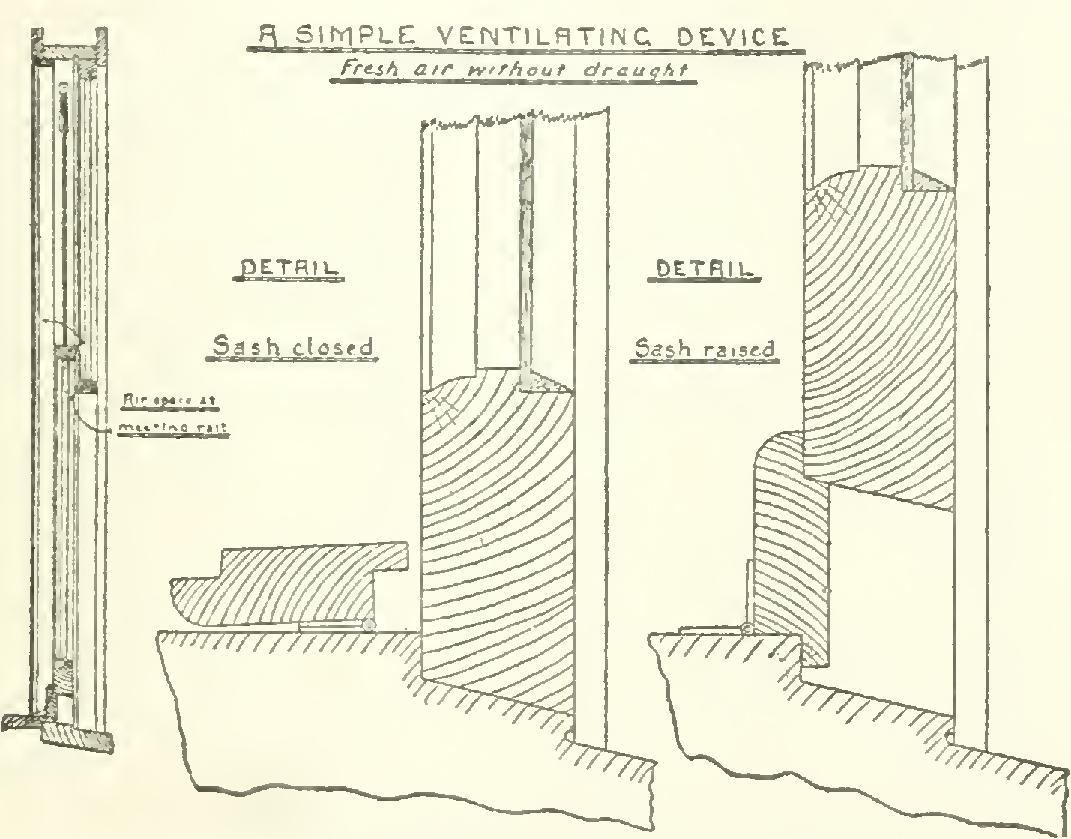 It has, of course, nothing new in the idea, for most writers on ventilation have suggested that a strip of wood could be employed at the bottom of the window-sash, so as to admit air at the meeting rails. The writer has found it best, however, to hinge the strip to the stop or to the window-board, and also to rabbet it as shown.