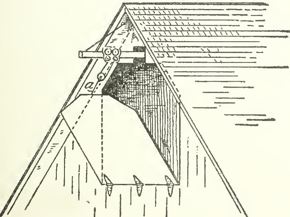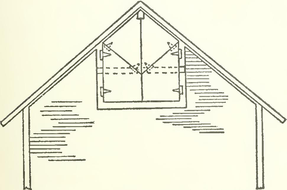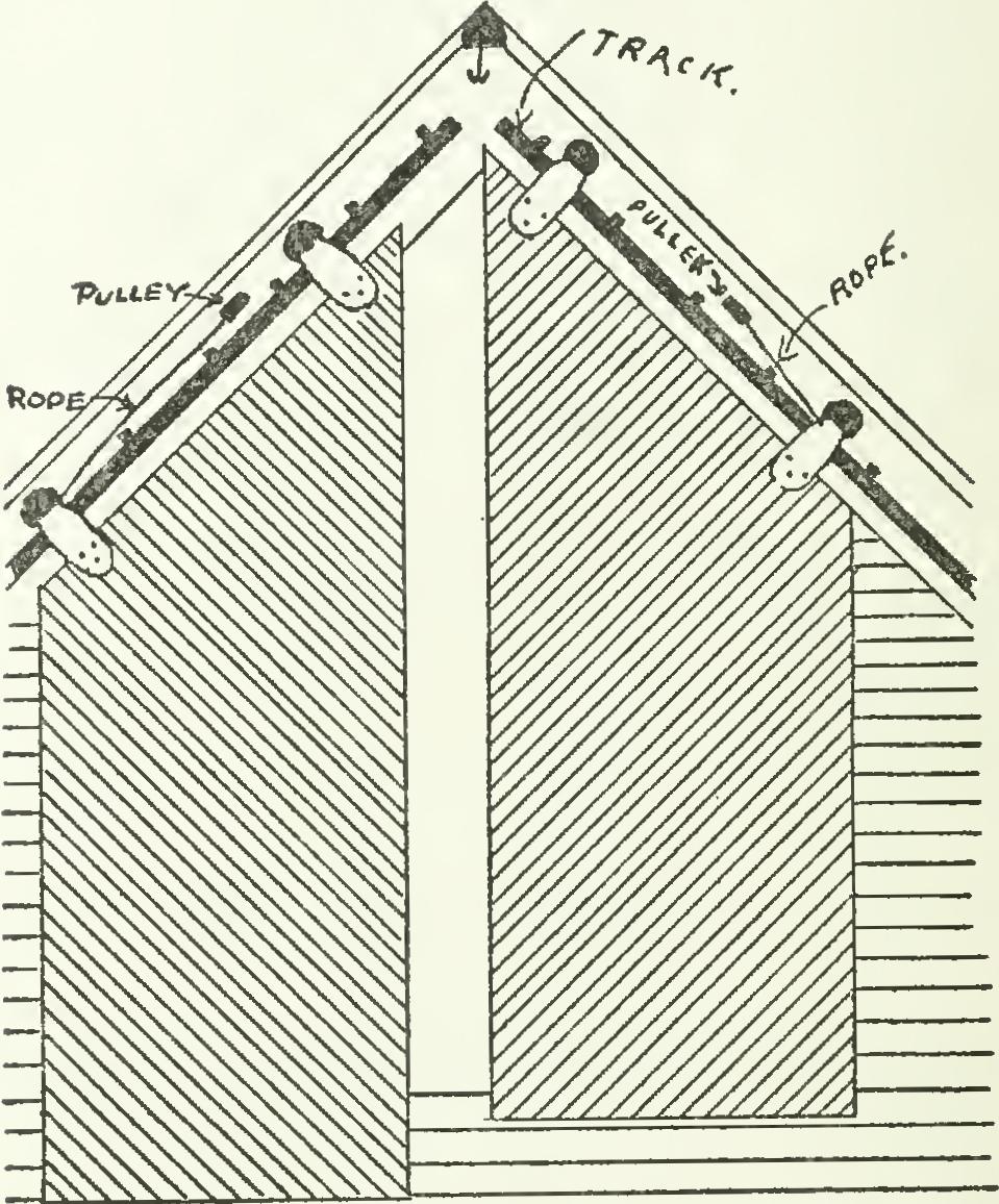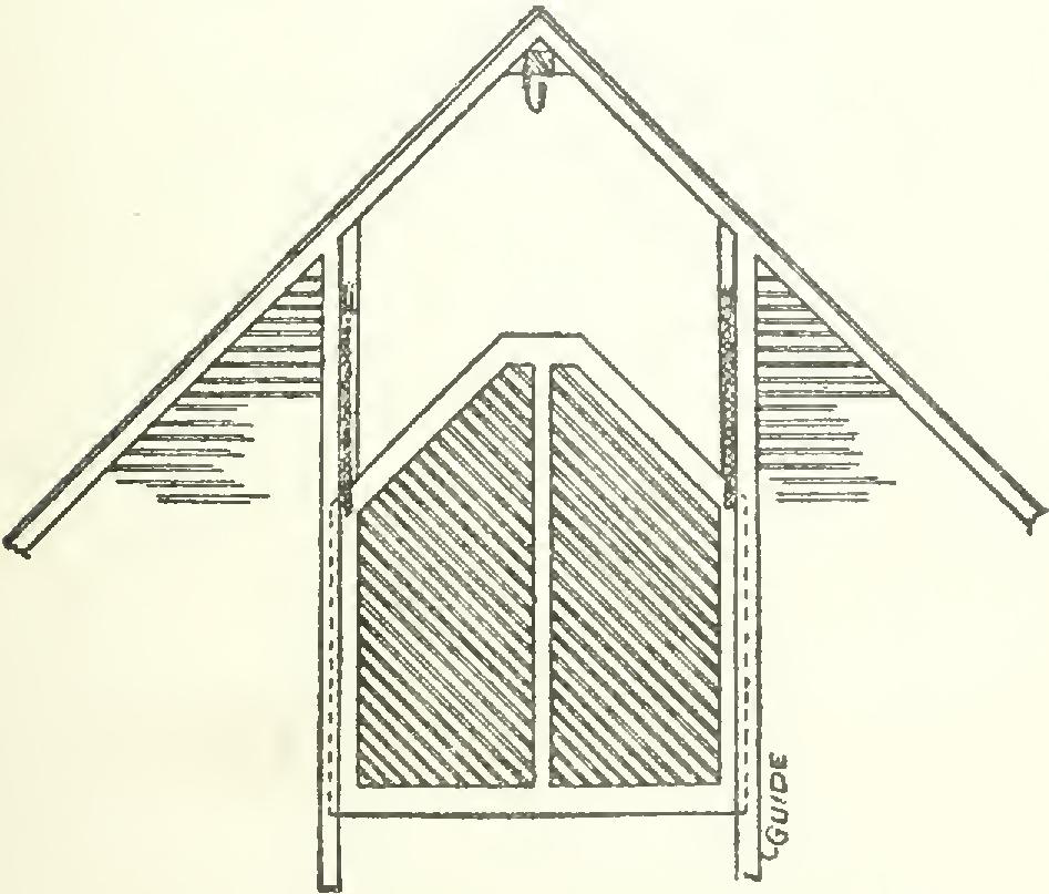 To fasten the doors open, make a double ended spiked pole, with which press the outer or top fold of the door up firmly against the fascia, seating the lower end of spiked pole near the bottom of the door. There should be a 2 by 4 or a 2 by 6 bar across the opening to hook the doors to, as well as for safety, while opening or closing.