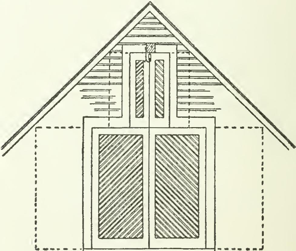 Fig. 142 is for double doors, with small doors from these up to the carrier. With this arrange ment, the doors can be hung with butts, and will swing clear of the cornice; but there should be a movable cross-bar at the top of the big doors to give a solid bearing to shut against. The bar can be removed when putting in hay, thus leav ing a clear space down to the larger opening, Fig. 142. Double Hay-Mow Doors.