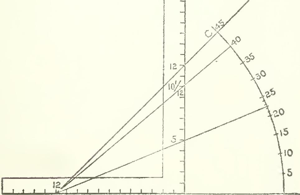 How to Frame by Degrees With the Steel Square. The steel squares that are in general use do not contain a degree scale for framing purposes, though unquestionably it would be a good thing instead of some of the obsolete rules that now encumber its faces. However, in the absence of a protractor, the angle may be found as shown by the accompanying illustration, Fig. 66, as follows: Lay off a line, as at AB, and apply the square as shown, and draw line AC from 12 on the tongue and passing at 12 on the blade. This line will be at an angle of 45 degrees to AB. Now, with the compass, strike an arc of any ra A Fig. 66. To Lay Out an Angle with the Steel Square.