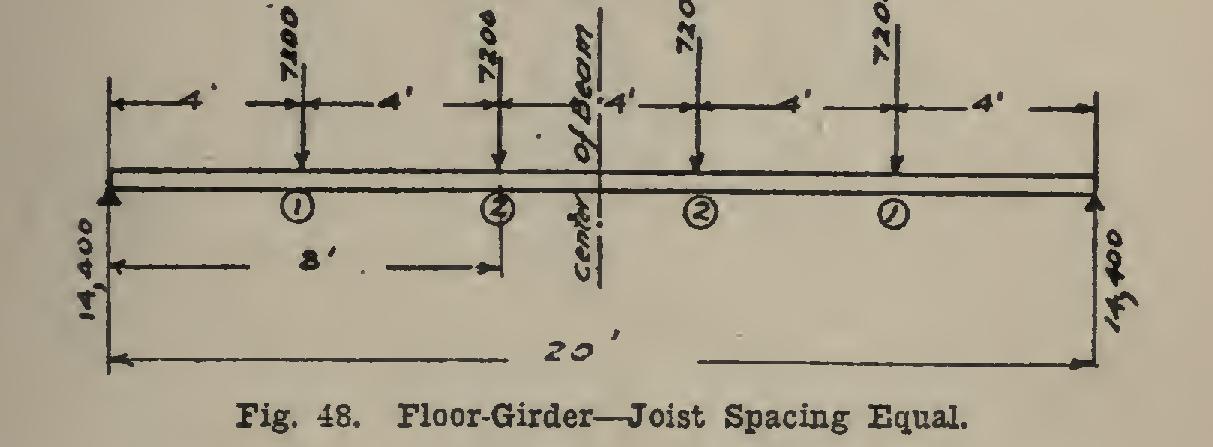 There should always be an uneven number of spaces on the cross-girder, as in Fig. 48, where there are five. If there were an even number, one floor-beam would come in the cen ter of the cross-girder (see Fig. 49), and this would (as you will find by designing the beam) require a larger cross-girder to carry the same load than would be required if the number of spaces were uneven. In cases where they are spaced as in Fig. 48, the moment will be the same under each of the beams equidistant from the center of the cross-girder; and also it will be the greatest under the beams nearest the center of the cross-girder. In the case of Fig. 48, the greatest moment is : pound-inches.