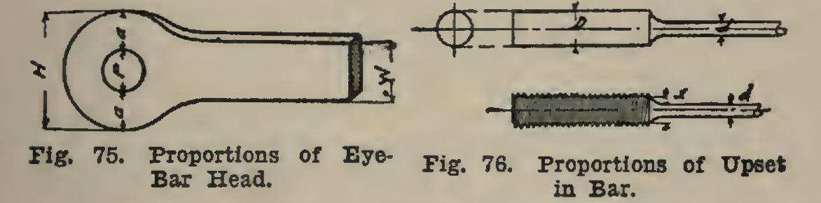 In case the stress is not great, round or square bars may be used. These usually have screw-threads cut on their ends, after first being upset at the ends to such a degree that after the screw-threads are cut the diameter x of the bar at the bottom of the threads will be slightly greater than the diameter of the bar d (see Fig. 76). This upsetting is done by first heating the end of the bar, which is longer than it is re quired to be when finished, and then placing it in an upsetting machine, which forces the end in the form shown. In (C 205-206) is informa tion regarding the upsetting of bars. The reader should carefully read the notes at the bottom of (C 206).