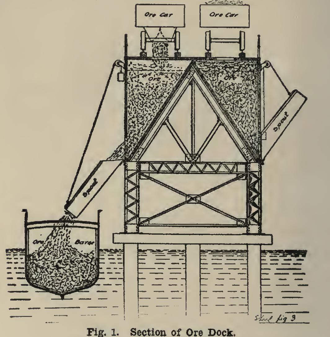 3. Occurrence. The ore may occur at con siderable depth below the surface, in which case it is mined by the use of shafts and cross-head ings, the method being similar to that employed in coal mining; or it may occur in form like loose clay and in huge pockets, or in heaps or small mountains, at a short distance under the surface, in which case the surface dirt is stripped off by means of steam shovels and the ore is loaded on by the same means. Many of the mines in the Lake Superior Region are of this kind, and the ore is taken out very economically, loaded on cars, and shipped to the ore docks at the lake. Here it is stored in the dock hoppers; and when a boat comes to be loaded, spouts are lowered to the several hatches of the boat, and the coal thus delivered on board. See Fig. 1 and Plate 1. These huge steel barges can carry as much as 12,000 to 13,000 tons at a time, can be loaded at the rate of about 100 tons a minute, and unloaded at the rate of 35 tons in the same period of time.