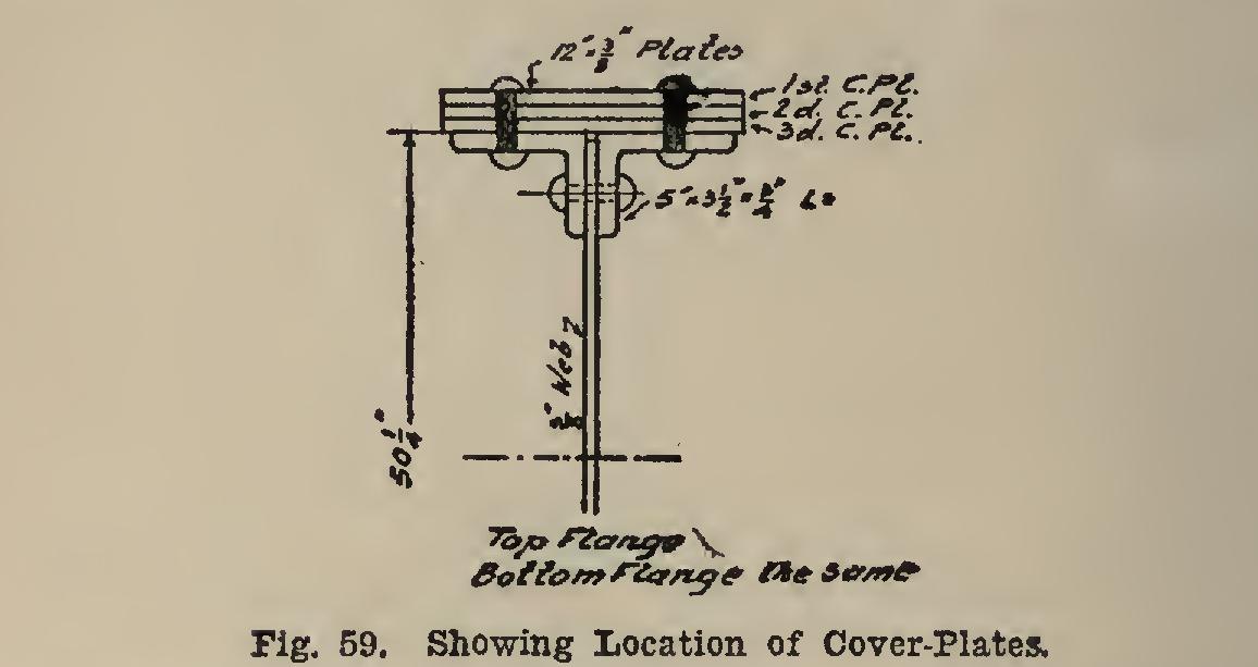 The section is as shown in Fig. 59, the web being inch thick. It may be said that unless the depth of the girder is less than of the span, a web will be sufficient. The total net area of the flange is: 3 Cover-plates, 12 by in., at 3.75 each=11.25 sq. in. 2 Angles 5 by 3i by in., at 5.06 each=10.12 sq. in.