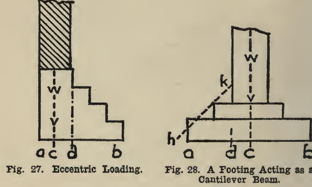 possible to make these exactly opposed to each other; but it is manifestly better that the wall a have a slight tendency to lean toward the open ing than from it. This is the result when the upward reaction is at b rather than at C, when the weight of the wall is centered at W; and it is clear that the footing should be narrower or alto gether omitted under the doors and windows. It is impracticable to state this rule very def initely, since there is always considerable rig idity in the masonry, which makes it impossible to fix the exact point of application of the up ward reaction of the soil. However, in general, the ends of a wall should have rather better support than the middle parts; and the outside walls better than those in the interior.