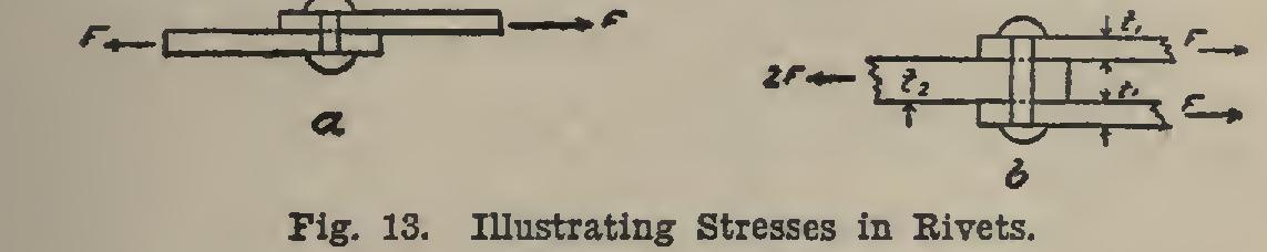 Stresses in Rivets. The stresses which come on a rivet are: Shear, which is the tend ency to be cut across its section; the bearing on the plates it connects; and the tension on the heads, due to contraction. Referring to Fig.