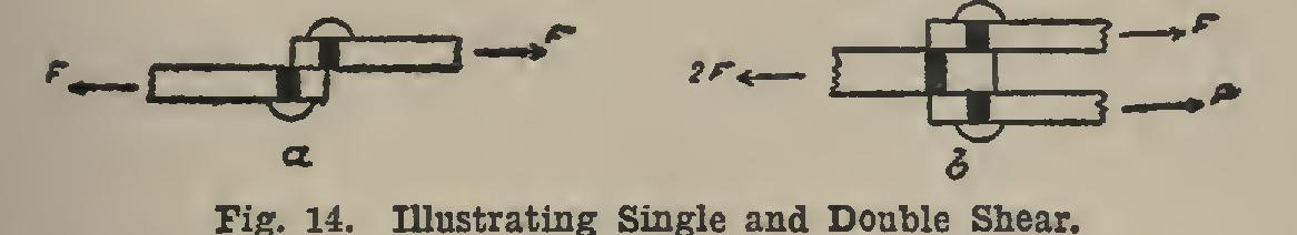 13 (a and b), it will be seen that if the joints are like (a) and the two plates which are pulled in opposite directions are so strong that the rivet will not pull out of them, then it will be cut in two at the point between the plates, and will become as Fig. 14 (a), being sheared off in a manner somewhat the same as if it were cut by a pair of shears. When the conditions are such as shown in Fig. 13 (a), the rivet is said to be in single shear.