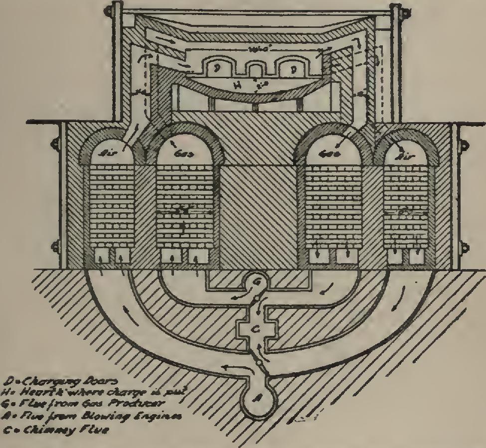 The charge is melted by the burning of either natural or artificial gas (producer gas) and air forced in under pressure. These enter the fur nace on opposite sides of the hearth, join, burn, and beat down on the charge, thus melting it and keeping it melted.