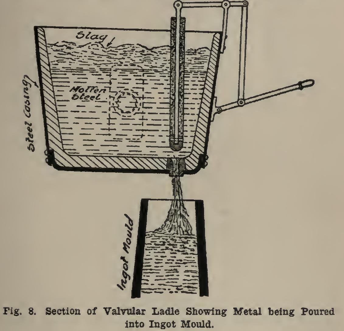 16. The Ingot. In order to prevent the slag from getting into the ingot, the metal is poured from a valvular ladle, Fig. 8. The ingots may be almost any size. The ordinary size for rails is about 63 inches high and 14 inches square, weighing about 2,000 pounds; but from this size the ingots run up to 24 by 26 inches and 5 tons in weight, or even larger, as the case demands (see Fig. 9).