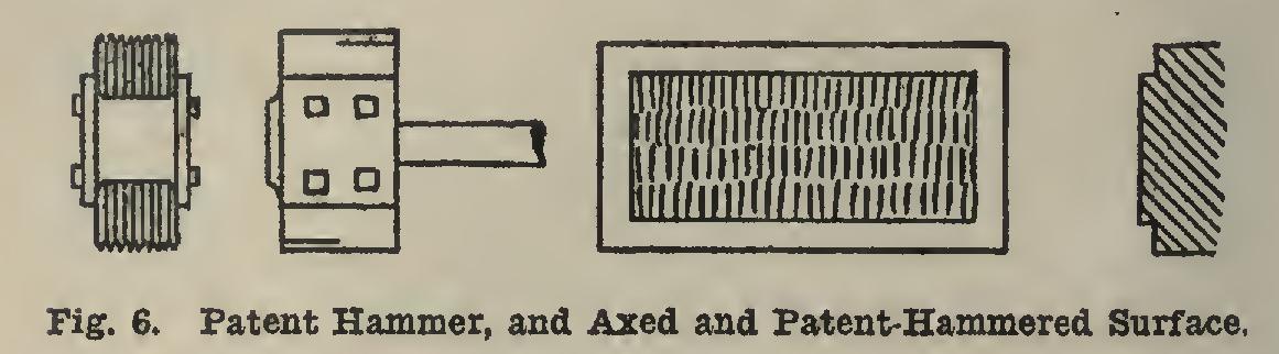 and patent hammers make straight marks instead of conical holes in the stone; and these marks are made parallel to one another over the entire surface to be dressed (Fig. 6). The ax makes one mark, and the patent hammer several marks, at each blow. If the edge of the ax be cut to form teeth, the tool is called a tooth-ax.