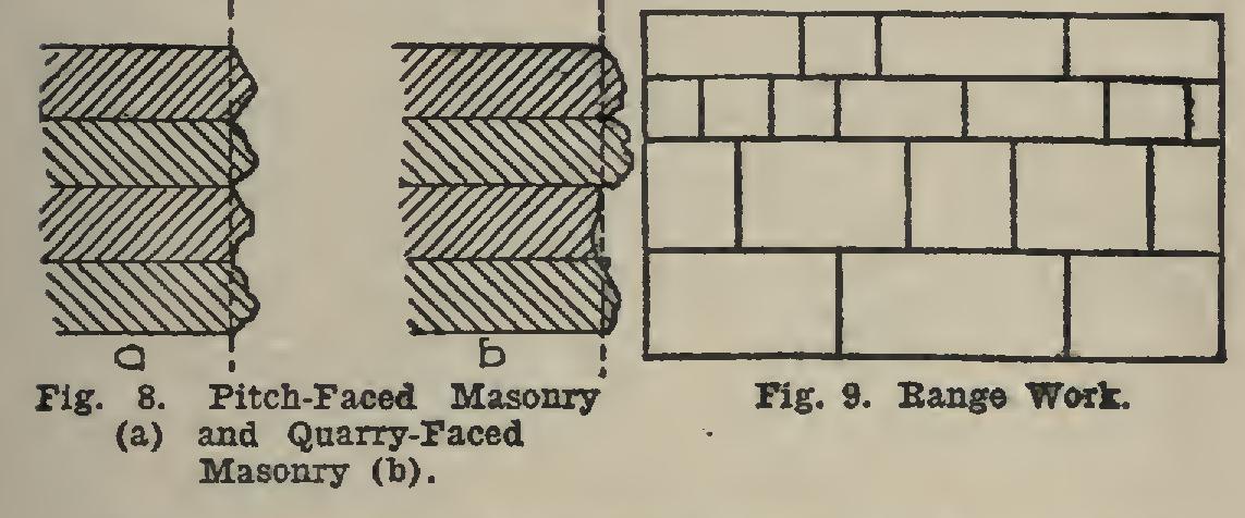 Pitch-7aced and Quarry-Faced Masonry. The sketch, Fig. 8, shows clearly the distinction between the two methods of laying the stone. It will be noted in a, that both the upper and lower front edges of the pitch-faced stone are, in the same plane. This arrangement requires con siderable more care than is necessary in break is an analogy between the distinctions of range work and of rubble work; but the latter is made of irregular-shaped stones, while the former is composed of rectangular pieces.