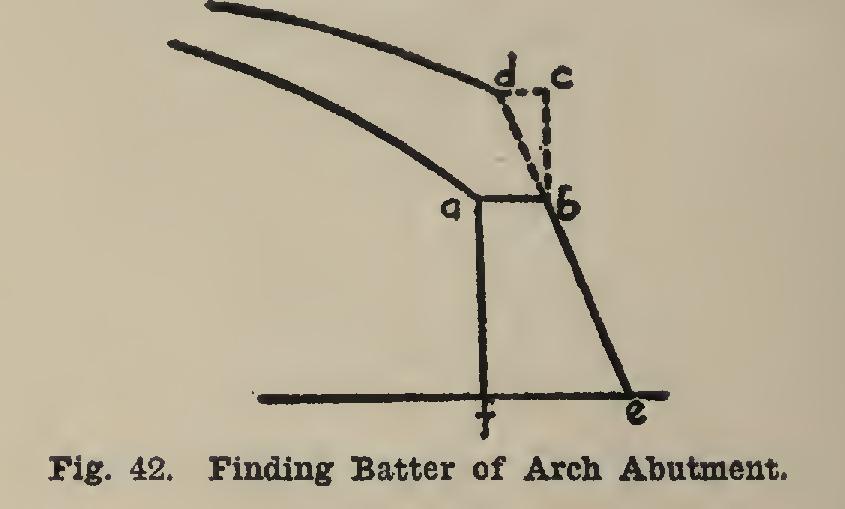 Having computed the proper thickness at the springing, the hatter of the abutment is found as shown in Fig. 42. The thickness a b is laid off; then b c is half the rise, and cd is of the span. This batter is produced downward to the bottom of the abutment, and the point d is joined with the extrados at the crown by a curve. The width of the bottom of must not be less than For example, let the height of the abutment of the second arch in Table 1X be 12 feet. Then the batter on the hack will be 12X3-:-8.25=4.36 feet; and the width of the bottom will be, by the rule, 4.36+2.47=6.83 feet; but the second re quirement makes it necessary to build it % of 12. or S feet wide.
