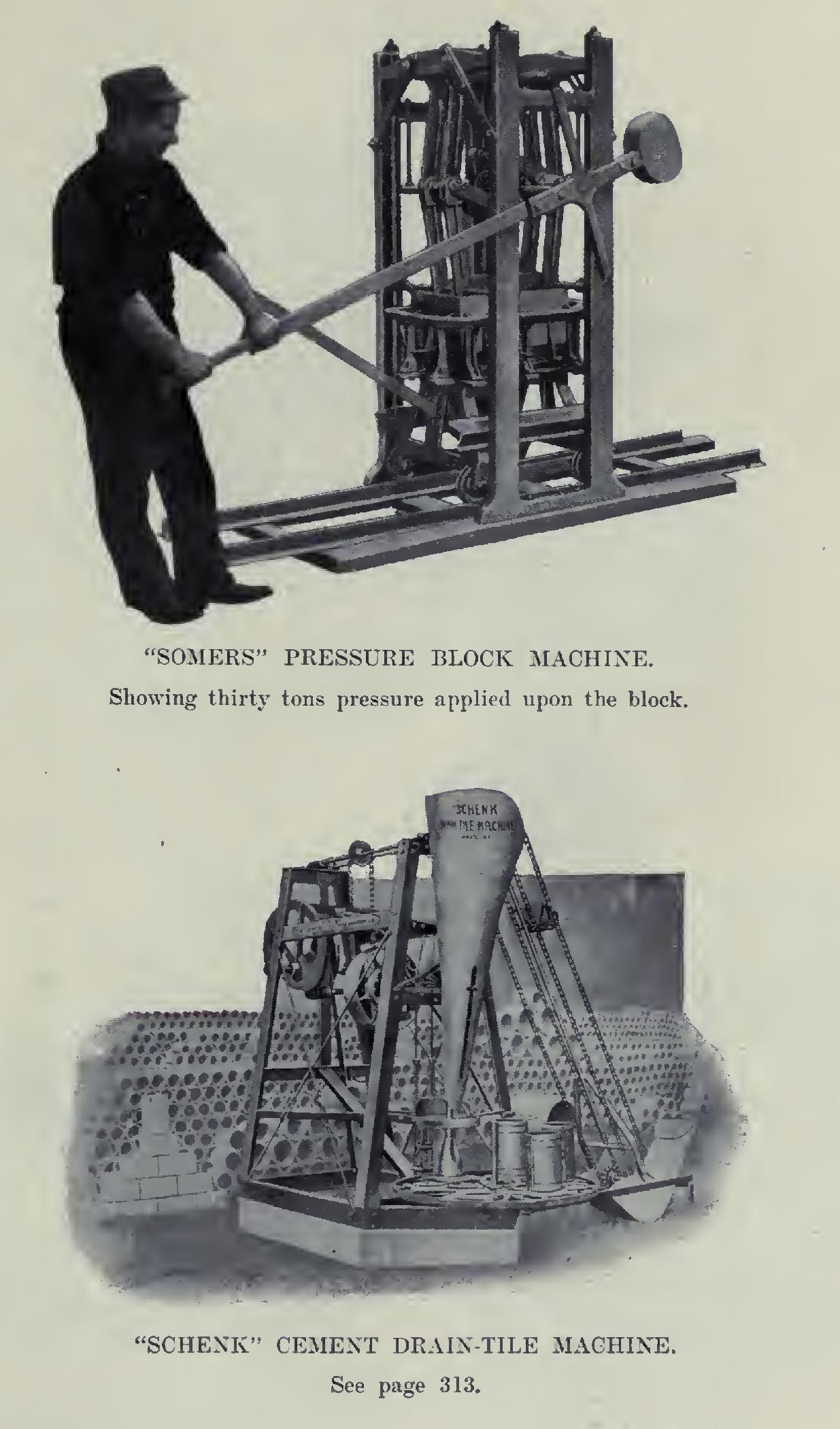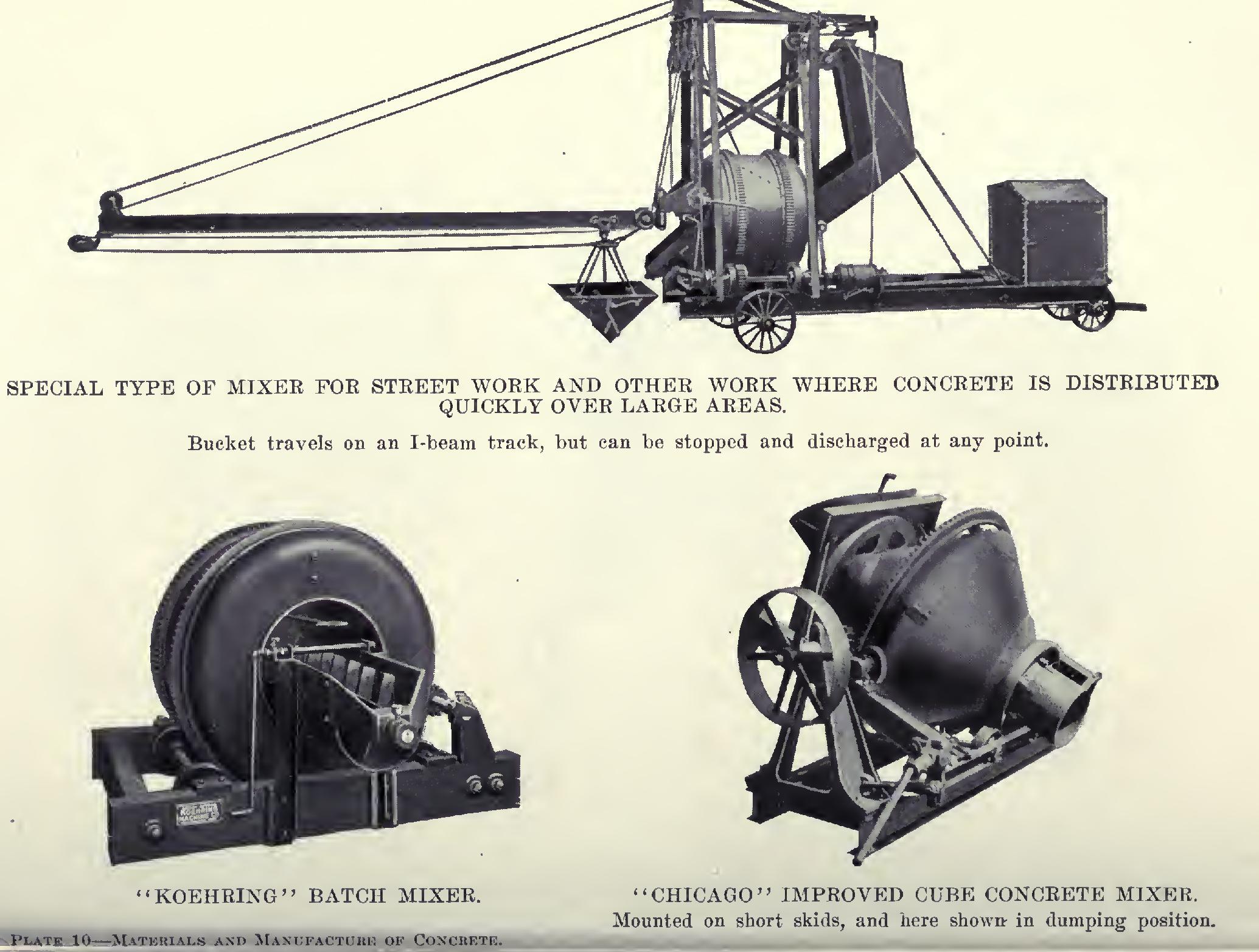 The "Standard" Mixer (Plate 9, lower figure) is a batch machine of the open-drum type. Its method of operation is clearly indi cated in the photograph. The mixing drum is tilted to whichever side desired, at an angle of about 45 degrees, and the material put in. With the rotation of the drum, the material is divided, and carried from the lower to the higher part of the drum, and returned again to the lower part, this operation being repeated during 25 to 30 revolutions of the drum. The operations of charging, wetting, and dumping are all per formed while the machine is in operation. When mixture is ready for use, the drum is tilted for ward far enough to either side desired, for the material to run out into the wheelbarrow or other receptacle placed to receive it. The interior of the drum is completely open to view and acces sible at all times, for cleaning, inspection of con tents, etc.