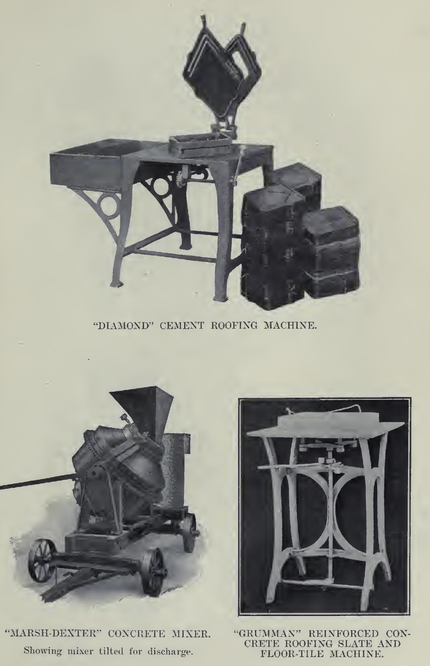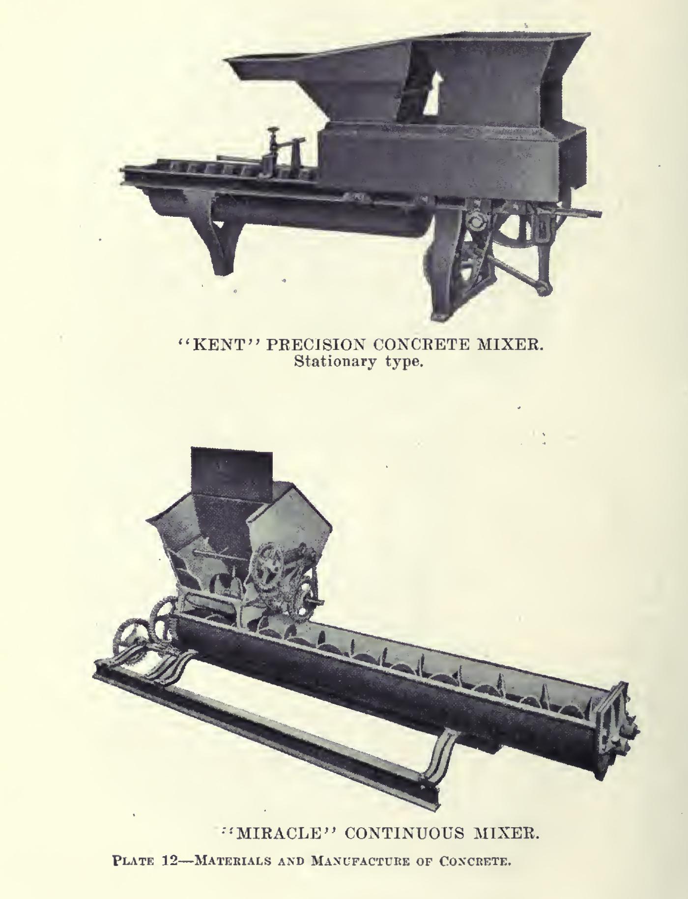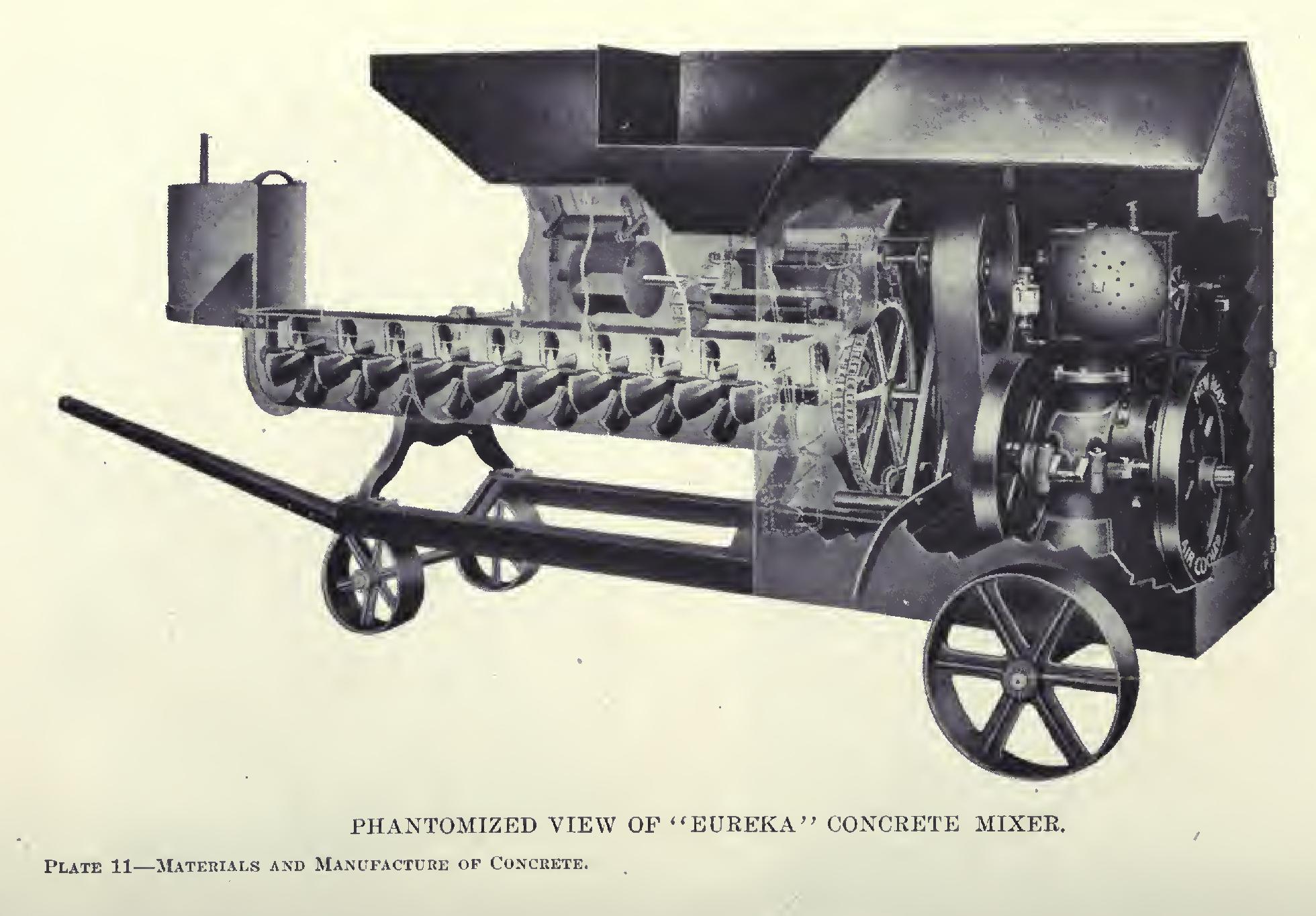 Among mixers of the continuous type, some are equipped with special devices for auto matically measuring the ingredients and feeding them to the machine in the proper proportions to give any desired mixture and consistency. The "Eureka" Mixer, of which a phantomized view showing details of mechanism is given in Plate' 11, is a machine of this type. The cement bin and feeder—the smaller one shown in the foreground—has a pocketed cylinder revolving between concave plates, opening into the hopper above, from which the pockets in the feeder are filled, and discharging directly into the mixing trough below. Back of this, is shown the feeder for sand and gravel up to 2-inch screen size. This is a similar cylinder to that used in the cement feeder, except that it is larger, and, in stead of being provided on the discharge side with a concave plate, is surmounted by a roller, held by springs. This serves to cut off the ex cessive flow of material, but provides sufficient flexibility to allow the rough, coarse material to be fed through the machine without catching. The feeder for crushed stone is a similar con struction on larger lines, to handle material up to 3-inch size. These several feeders can be quickly set to give any desired mixture. An agitator is provided in the sand bin to prevent damp sand from bridging over the feeder and stopping its action.
