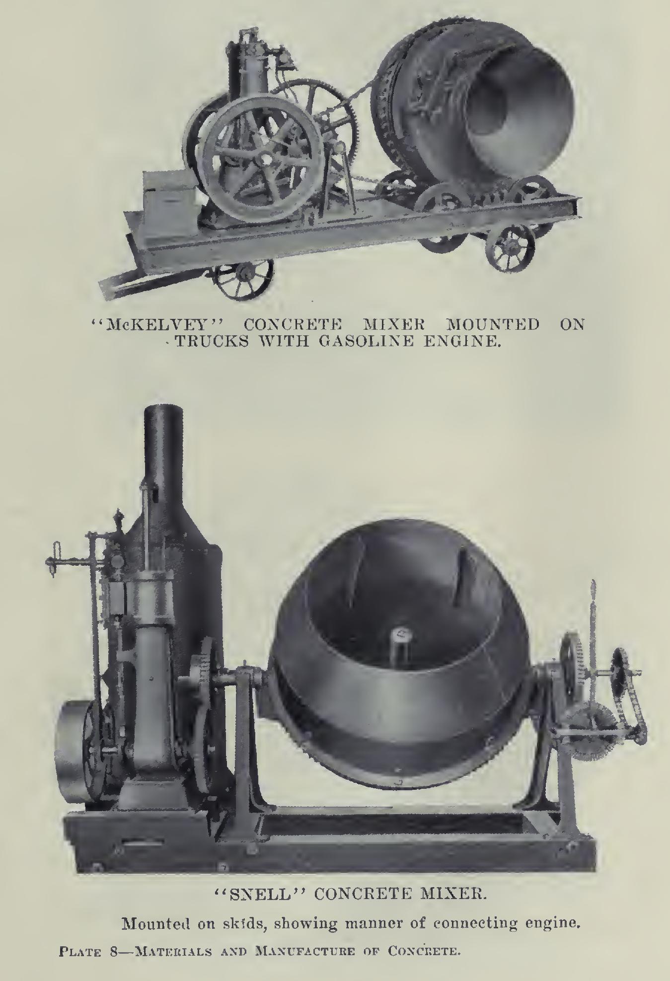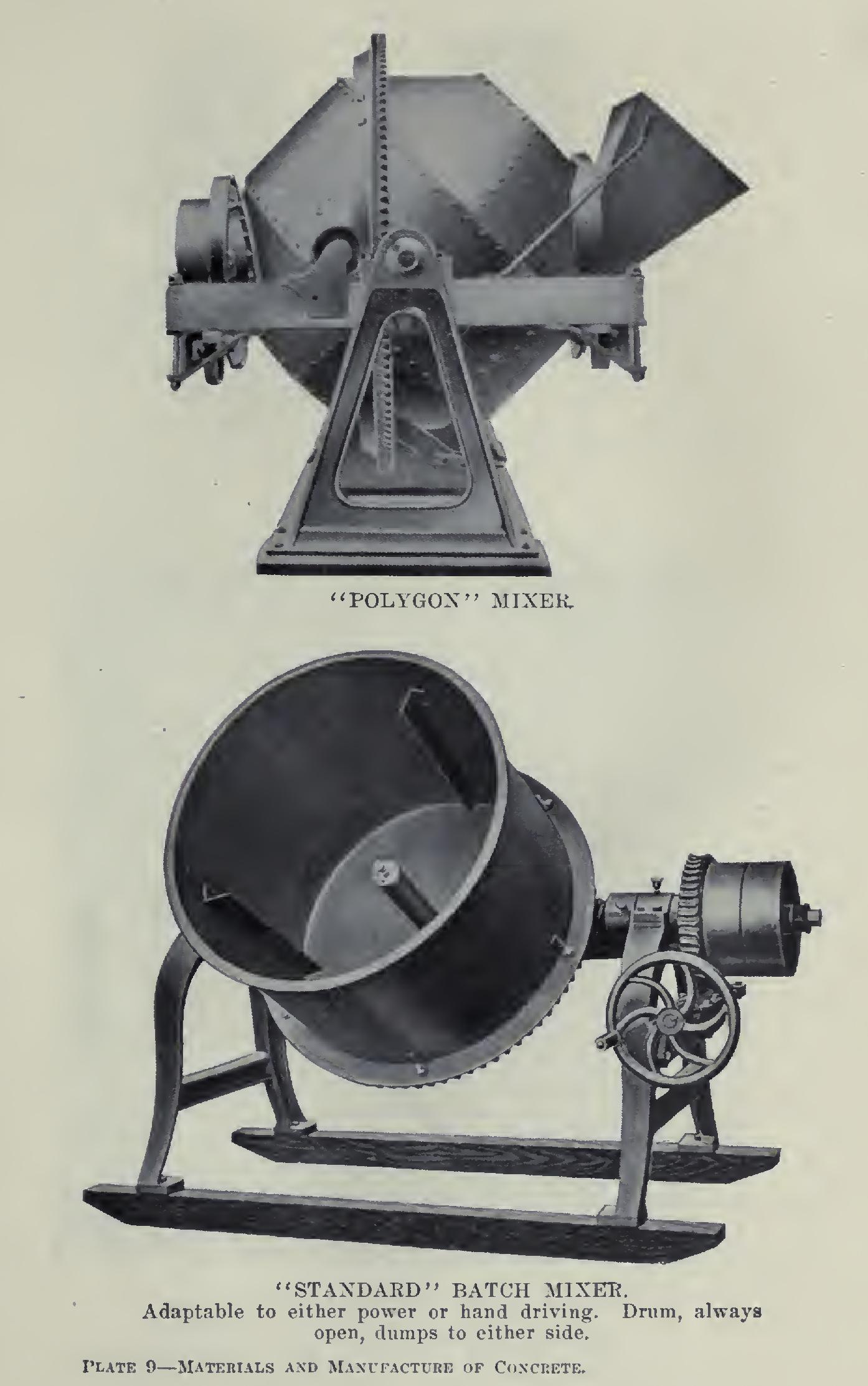 Very efficient machines of this class are found in the various types of revolving screens now on the market. Examples are illustrated in Fig. 19. These screens consist essentially of cylinders of perforated metal or wire cloth mounted at a slight incline and slowly revolving on a gear driven shaft. The finer meshes are at the upper end, the coarser at the lower end. The material to be screened is fed from a hopper or chute into the revolving screen at its upper end, and the successive sizes of ingredients are automatically separated by passing through the meshes as the material slowly find its way to the lower end of the screen.