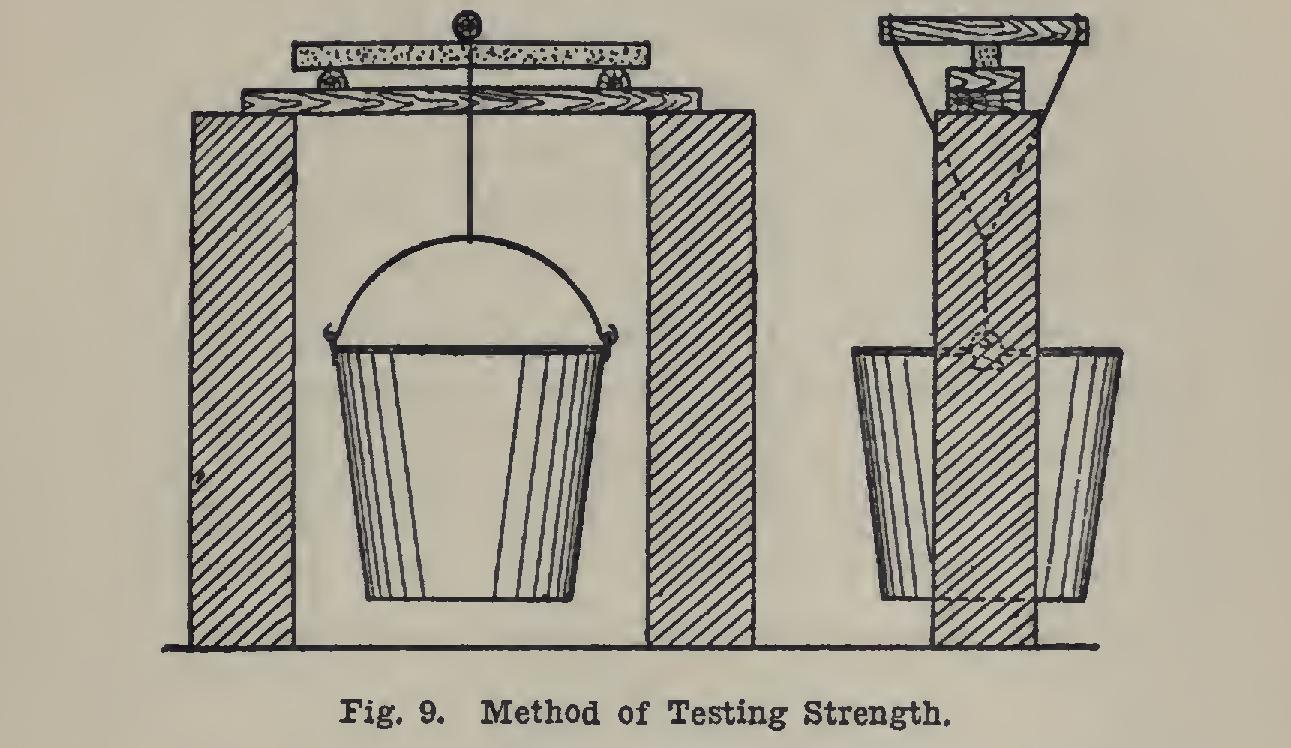 Take mortar from the mixing box, or make some of 1 part cement and 3 parts sand, thor oughly mixed dry and then wetted to form a stiff mortar; and fill the moulds, pressing the material in firmly, and smoothing the tops with a trowel. The moulds should be oiled slightly to prevent mortar from sticking. Put the moulds away in a cool and, if possible, a damp place, for 24 hours. Then remove the prisms of mortar, and place them in fresh water, neither hot nor cold, for 6 or for 27 days. Any prisms that are chipped or otherwise defective should be discarded. Make the apparatus shown in Fig. 9 with a board, a round piece of wood about an inch in diameter, and a pail. The bottom