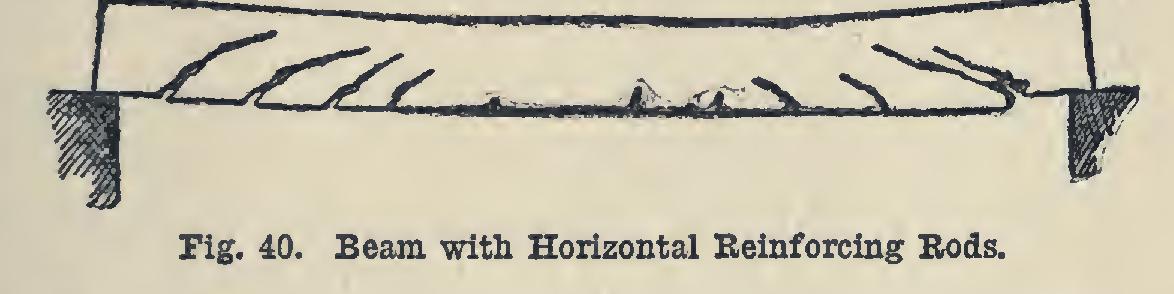 Fig. 40 shows a similar beam having horizon tal reinforcing rods located near the bottom sur face of the beam. The method of failure under a medium load, in this case, was said to be due to the ends of the reinforcing rods slipping in the concrete. The diagonal or slanting cracks are partially due to horizontal shear set up by the bending of the beam. These are sometimes spoken of as due to diagonal tension.