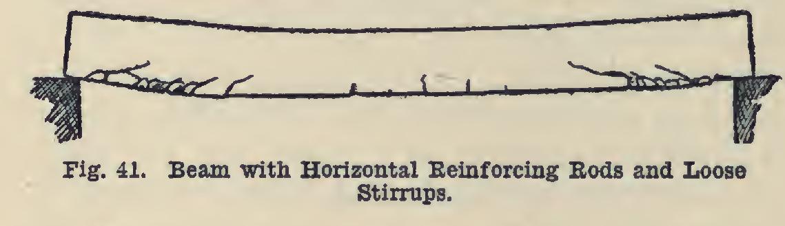 A means of fortifying against horizontal shear is by the use of stirrups. Bands or rods of steel or iron are bent in the shape of a U, and either placed loosely around, fastened rigidly to, or made as a part of the reinforcing rods. The detail of this construction will be given later under the head of "Materials for Reinforce ment" and "Reinforcing Systems." Fig. 41. shows the method of failure of the same type of beam as previously shown, but having loose stirrups surrounding the horizontal reinforcement bars and embedded vertically in the concrete. This beam failed when tested to destruction, by the slipping of the horizontal rods. The figure shows the shearing of the con crete along the horizontal plane above the rods, but no diagonal cracks. The stirrups evidently prevented the shearing action above the rods. As a means of preventing such a method of fail ure, some companies have either rigidly fixed the stirrups to their reinforcing bars or formed them as a part of same. The result of such a construction seems to throw the greater part of the body stresses of the beam onto the hori zontal bars for support. Some authorities con sider this a weakness in the construction.