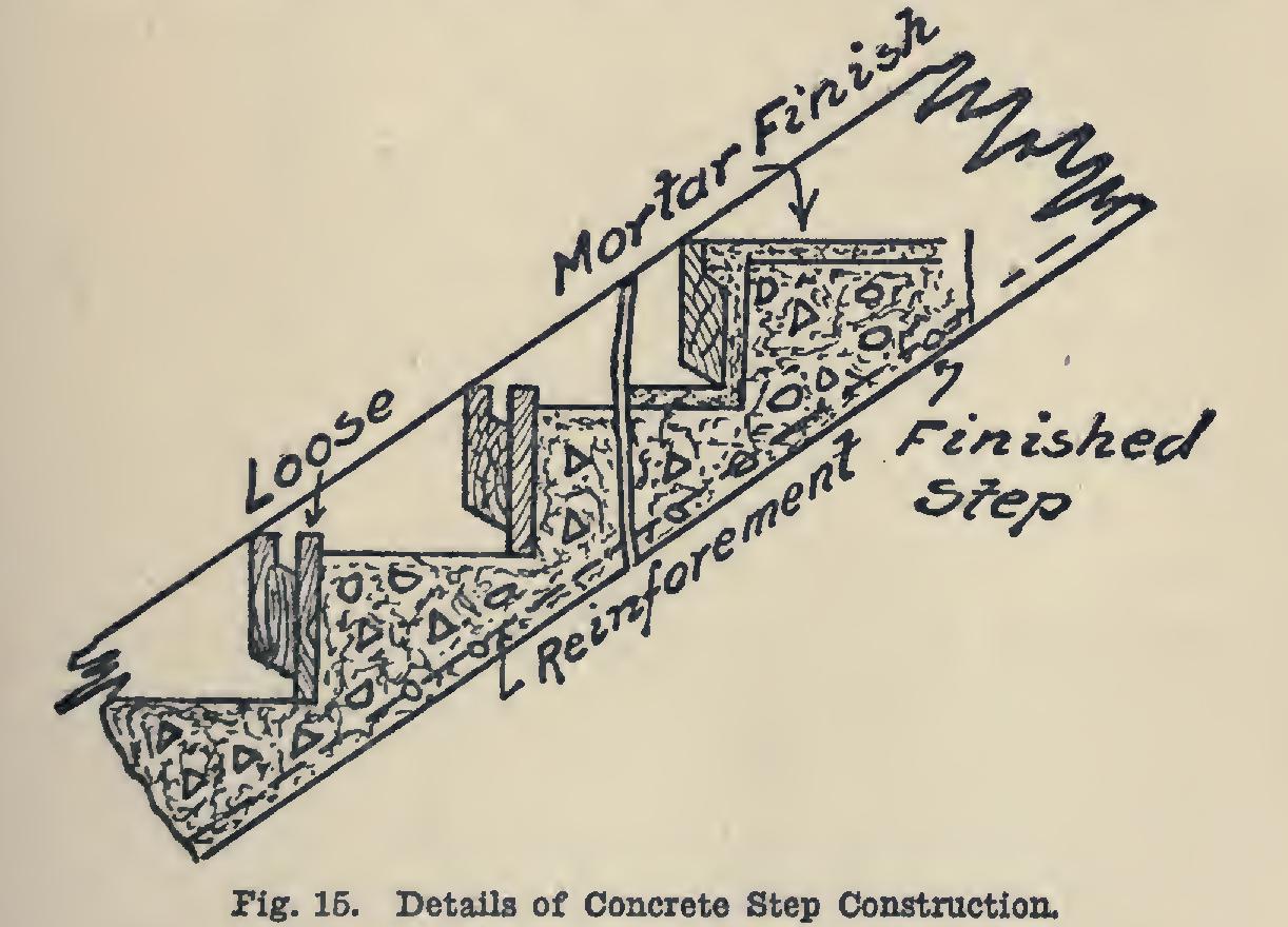 The next operation is to spread on the wire a layer of concrete about three inches thick con sisting of one part Portland cement, three parts clean, coarse sand, and six parts gravel or broken stone. Sufficient water should be used to make a mixture that will work through the wire cloth and completely surround it. Tamp well, and permit the concrete to stand for twenty-four hours. Starting at the top, place the boards be tween the planks to form the risers of the steps. The inner top edge of each board should. be grooved in a circular form to form the bottom of the nosing of the tread. Each board should be fastened securely to the planks. Just before the next mixture of concrete is applied, the base of the concrete laid before should be wetted. The forms should be filled with a mixture con sisting of cement mortar—one part cement, and two parts of clean, sharp sand. Trowel the top, and round at the edge to conform with the groove in the riser board.