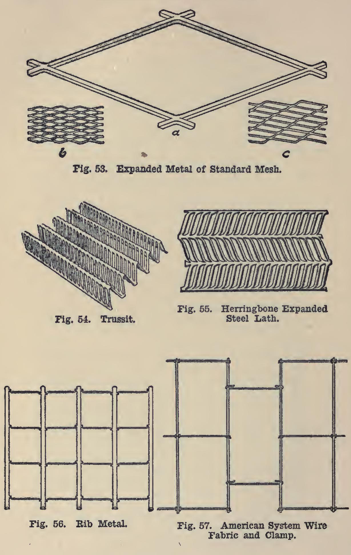Sheet metal, expanded metal, metal lath, woven wire, etc., are used in roofs, ceilings, sidewalks, concrete piles, partitions, short-span floors, columns, ornamental work, or, in fact, in almost any construction where there are not too great stresses, or where flexibility within the forms is needed. Plate 13 and Figs. 52 to 58 show some of the various forms of these ma terials.