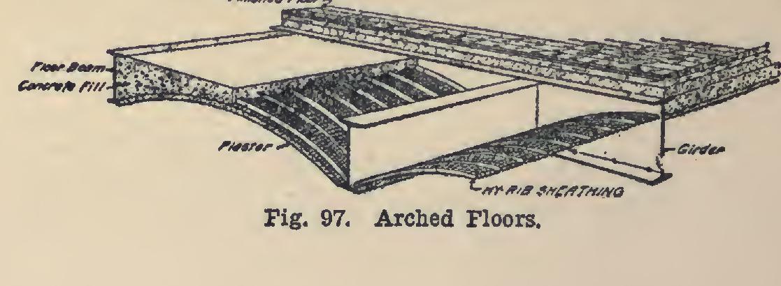 In case a reinforcing agent of such a nature were used that it would not hold the wet con crete mixture in place, forms would have to be employed as in regular floor construction, and the reinforcement placed in them in the usual manner. The arched type of floor is used for carrying heavy loads.