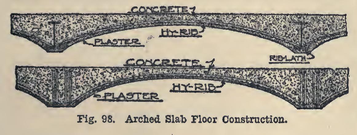 As examples of the arched slab construction, see Fig. 97 and Fig. 98. Both of these figures illustrate the use of a closely meshed reinforcing agent which in many cases proves of great as sistance in constructive work. With a small mesh material, the concrete may be dumped di rectly in upon the previously bent up forms, just enough of the concrete passing through the meshes to provide a rough surface for plastering on the ceiling formed by the under side of the arch. Ends of the bent-up sheets of reinforcing